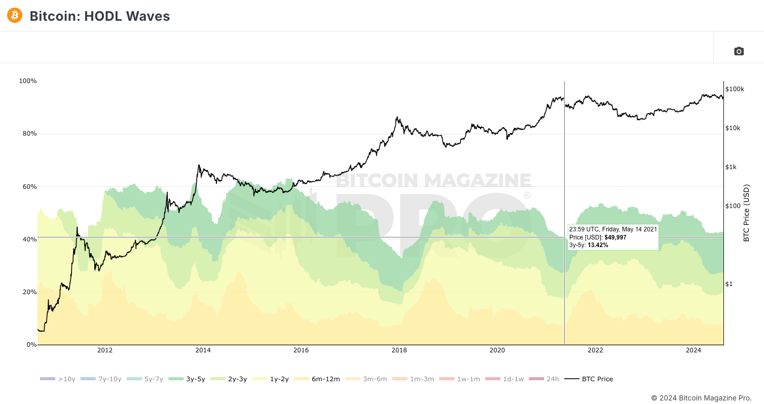 HODL Waves breaks down these UTXOs in terms of time. Which means we can look at cohorts of hodlers to see how strong those diamond hands are at any given time.