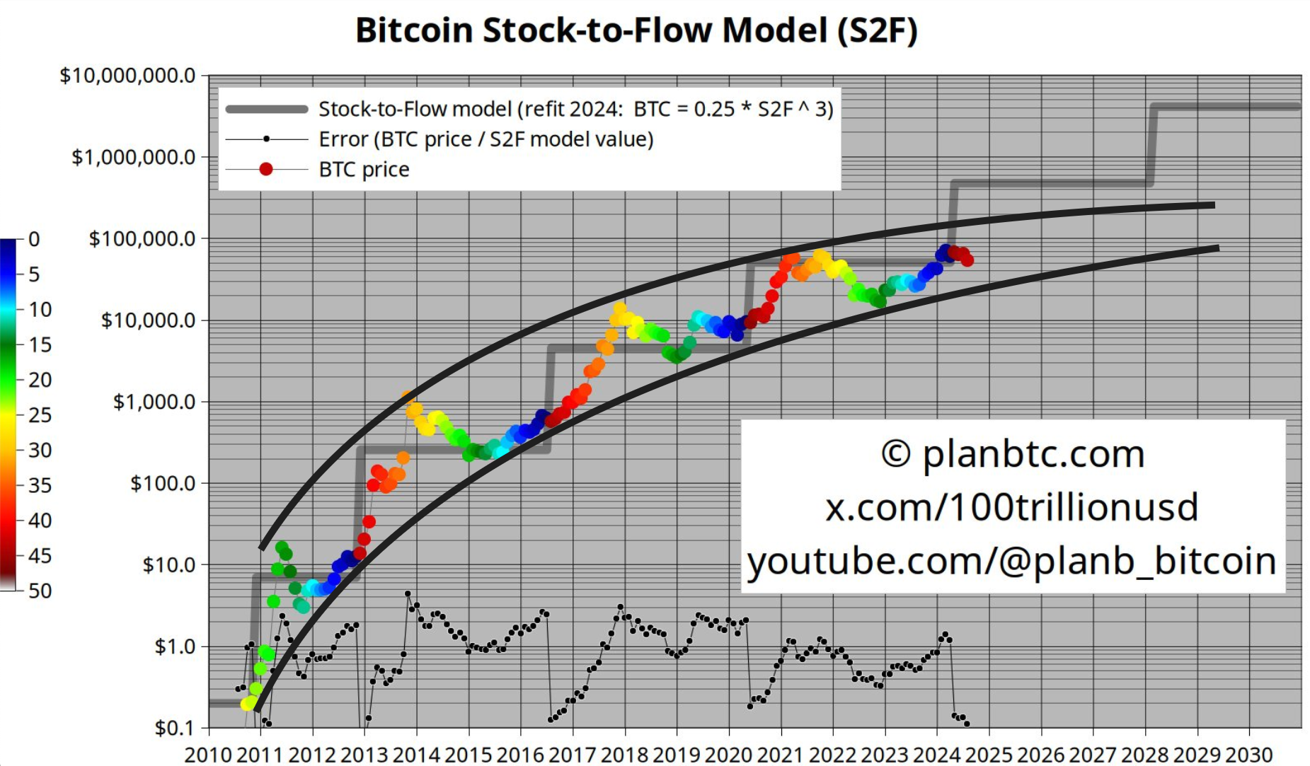Those models get tweaked to the downside each cycle. Note here how PlanB's stock to flow model is missing upside targets more and more. I added my very scientific black lines to the dots in order to help showcase it.