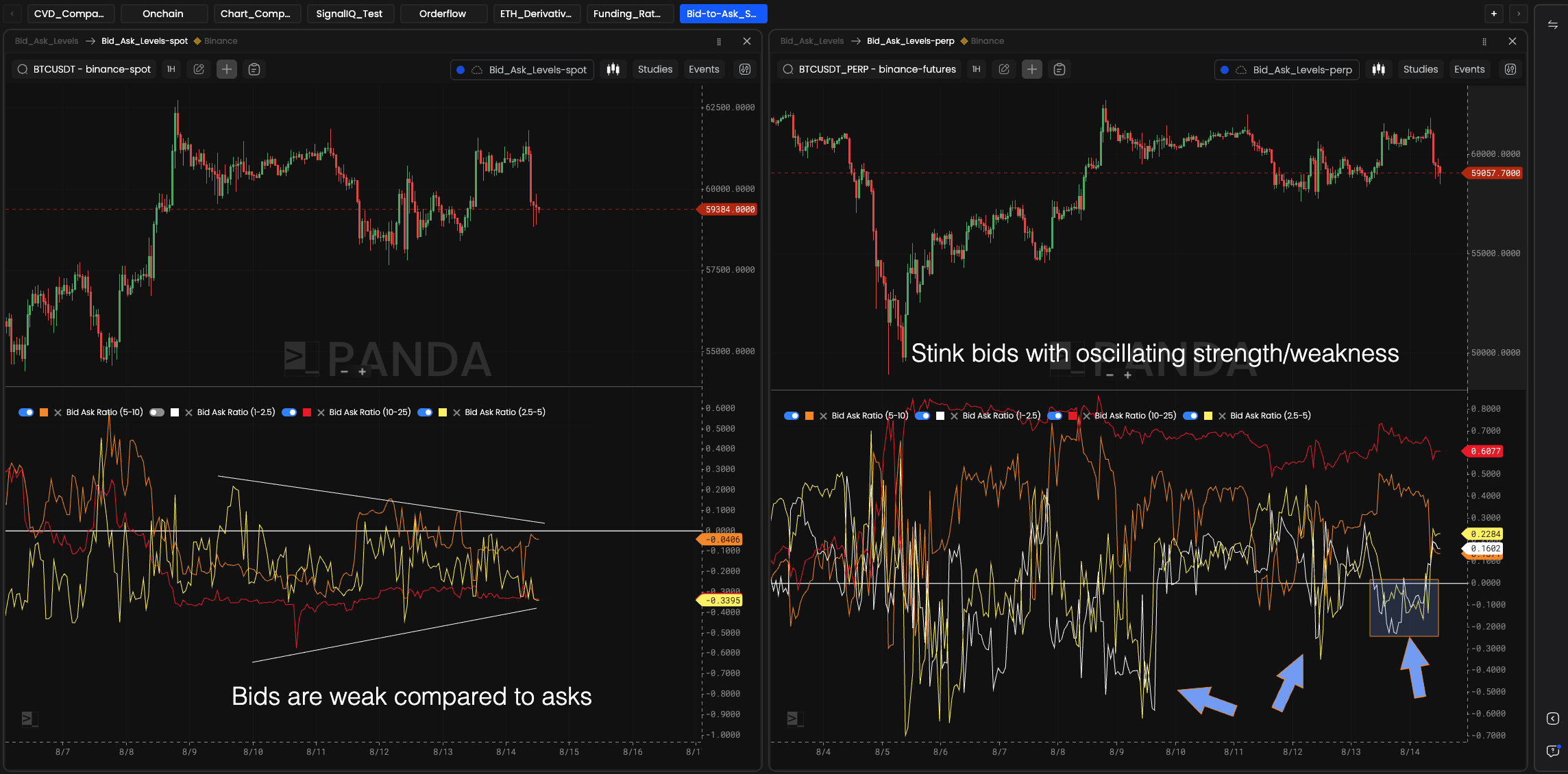 Then on the right-hand side we see Perps are showing mid-term fluctuations between 1-5% depths. This is the white and yellow lines that the arrows are pointing at.