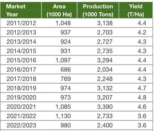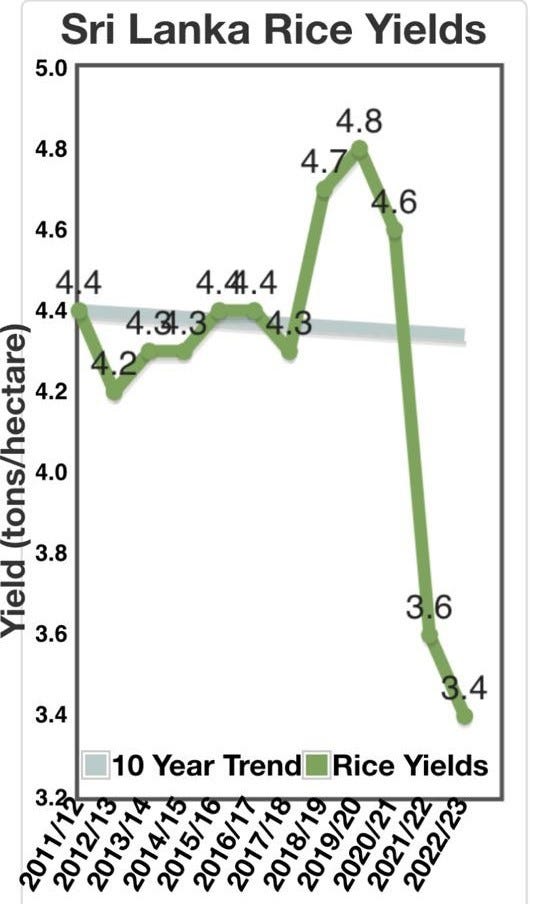 Below, we have two charts from the USDA that highlight how yield per hectare in Sri Lanka has decreased by more than a ton per hectare since the ban on chemical fertilizers, pesticides, and herbicides.