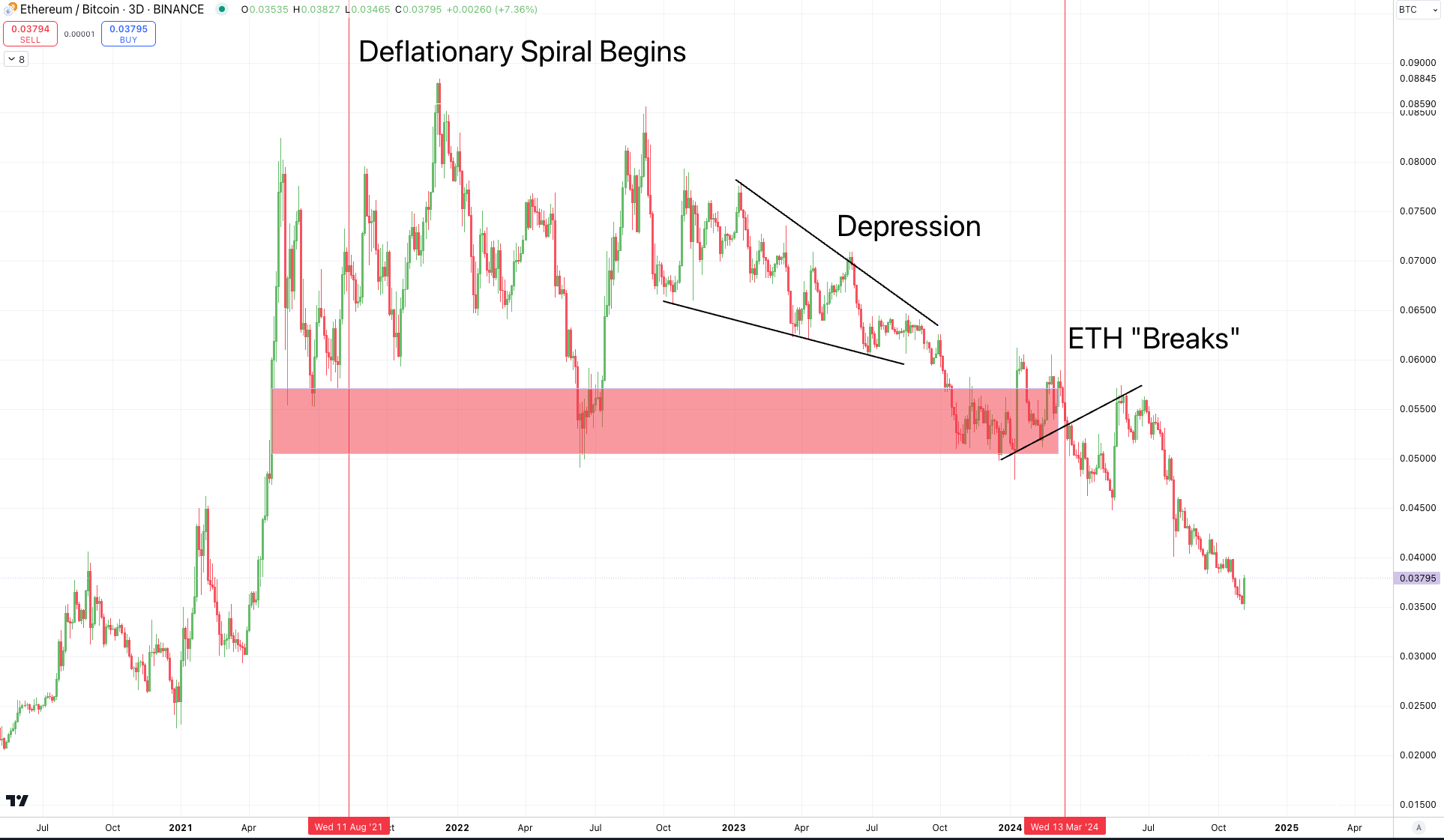 I know... I wrote March 2024 just two lines earlier. But to understand the significance of the terrible shape that ETH is in right now, we need to pull up a chart of ETH/BTC.