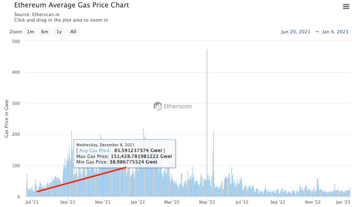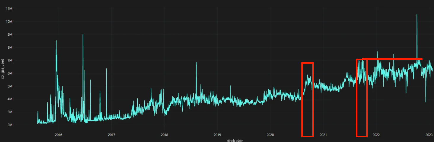 Now, the red line at the left is when Ethereum increased its gas limit.