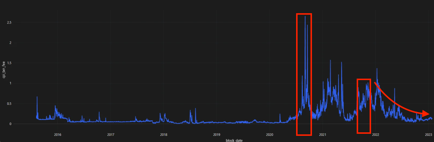 P.S. - Here is CPI w/o taking into account the price of each unit of gas. Note in 2020 how it jumps as a result of the network asking to use more gas per transaction during DeFi Summer. That's the first red box.
