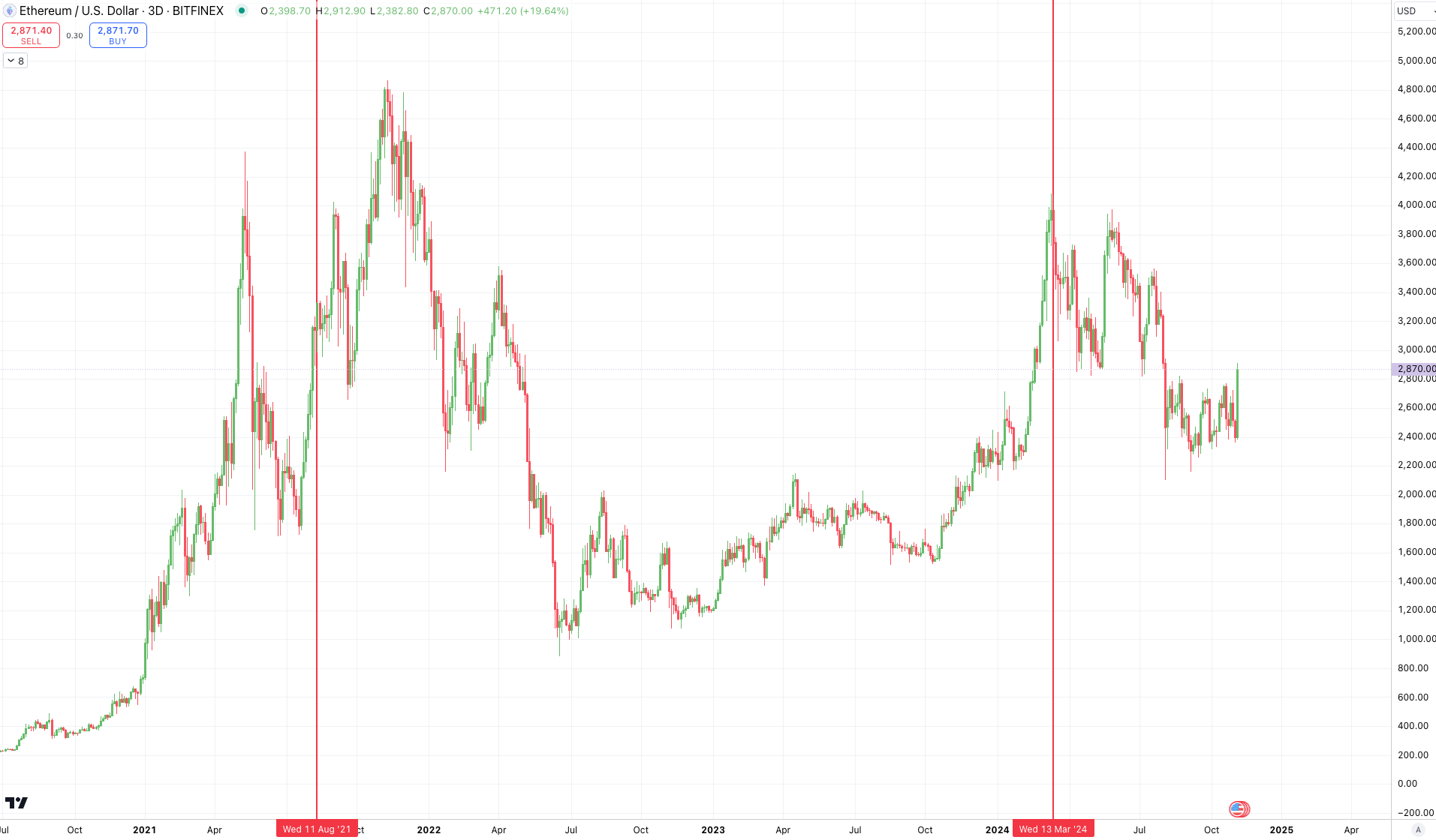 Time to look at that first vertical line in the chart earlier. To help, I dropped an ETH/USD chart below with the same vertical red lines.