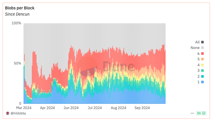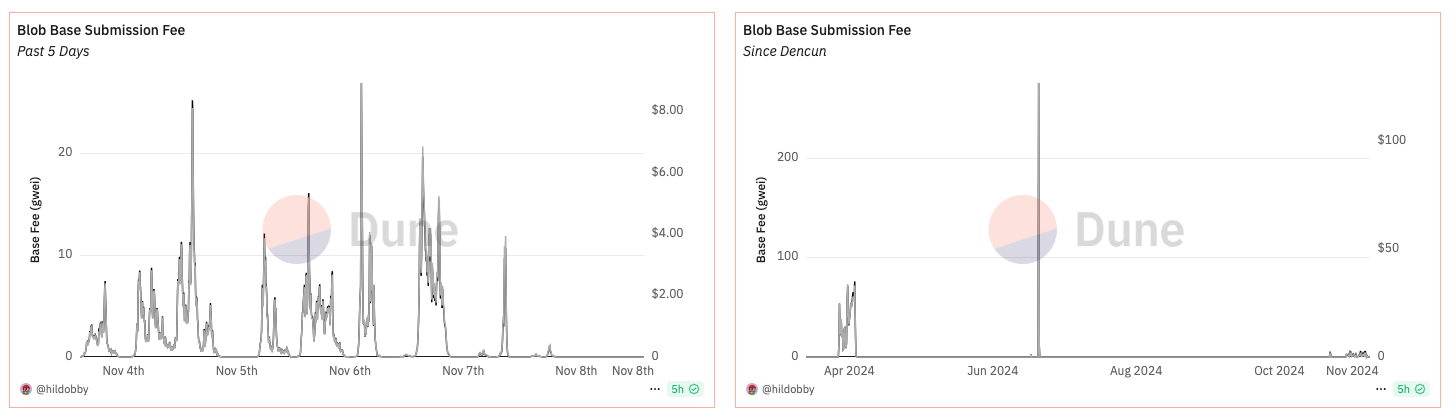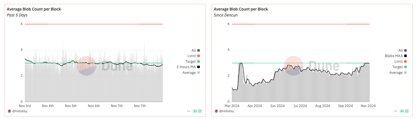 And here... Note: The one on the left is a five day look back while the one on the right is the average blobs/block since Dencun.