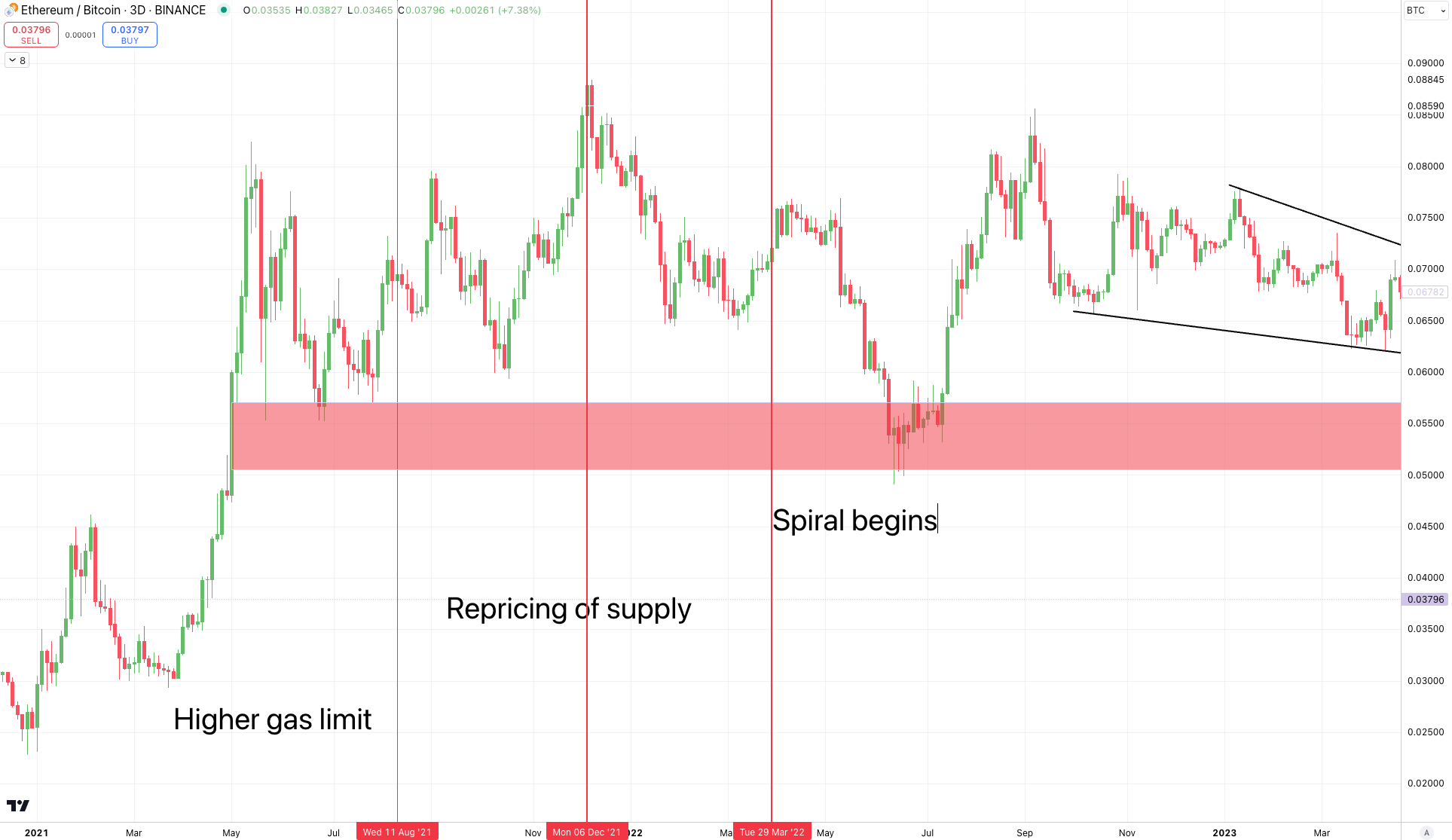 The price move in 2022 was likely exaggerated due to these fundamentals. We can even look at these moments on an ETH/BTC chart to see that these fundamental factors absolutely played out. Its movement compared to BTC was excessive.