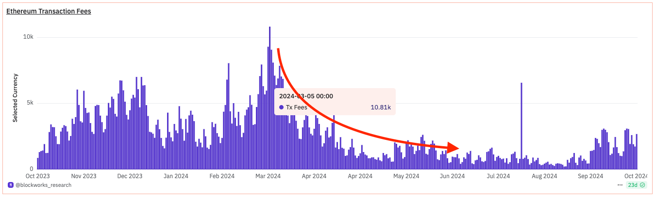 To illustrate how much this market changed things, let's pull up the chart from earlier. This shows the amount of transaction fees in ETH happening on Ethereum. From March's high of 10k, it took only weeks to get below 2k. Dramatic repricing.