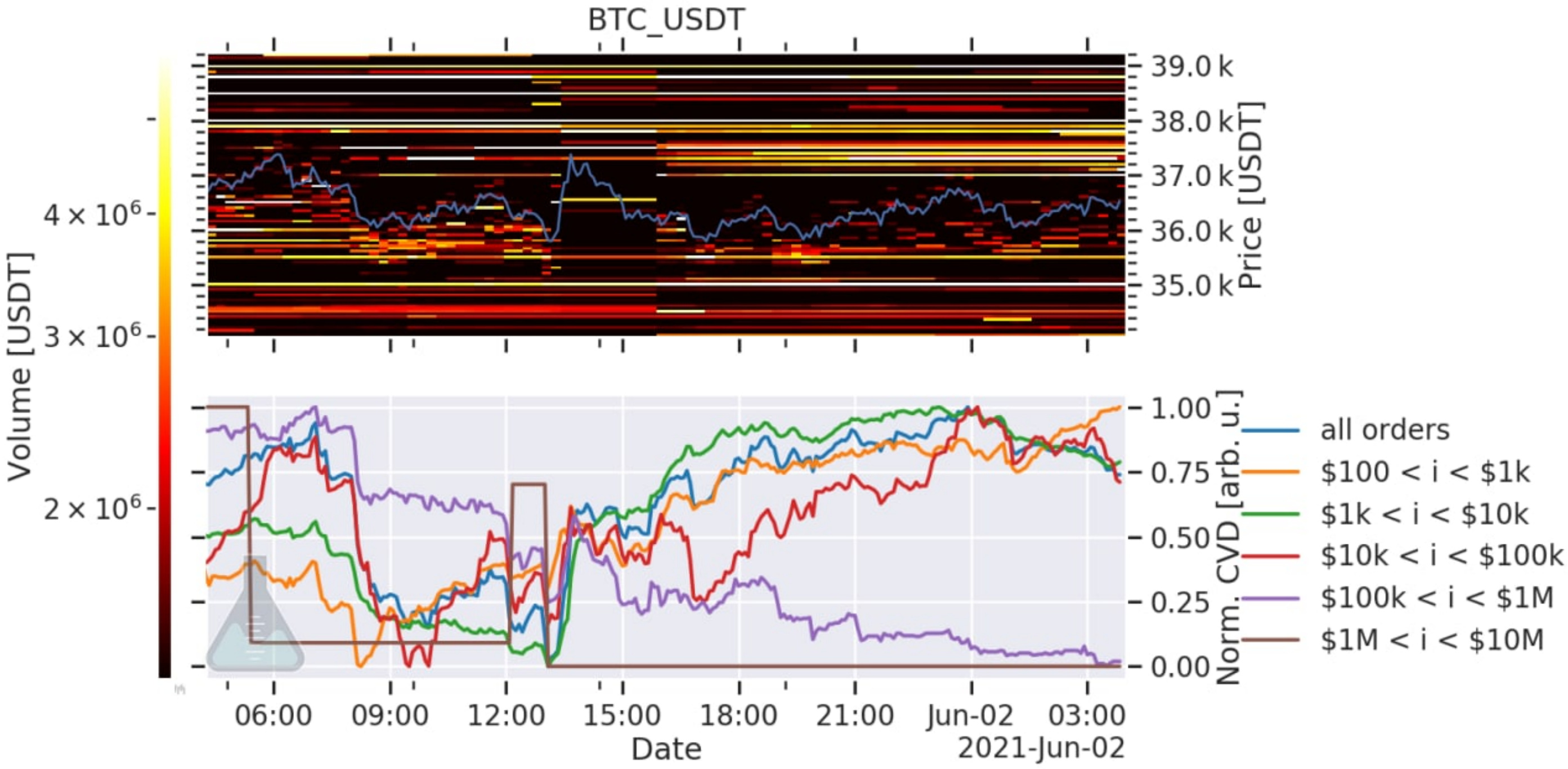 Also, on the chart on the top half… Note all the yellow lines above the blue price line. Those are large sell orders. They are populating the area from 37k to 38k. This is the same area we got a subtle rejection from yesterday.