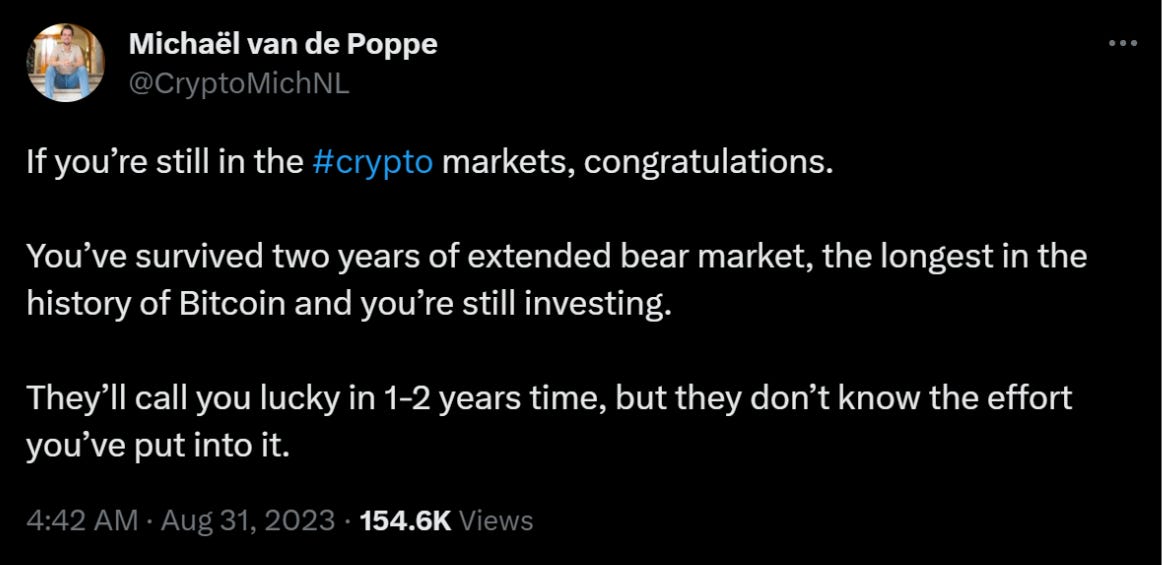 I came into Bitcoin and ETH in 2016, and I was kind of a summer child in that aspect. I basically bought it, and then it was up only for two years, and [I was] a bit naive to market cycles and whatnot. You just figure, “Okay, it's pulling back in 2018, whatever. It's gonna last a few months, and then it's gonna keep going up again.”