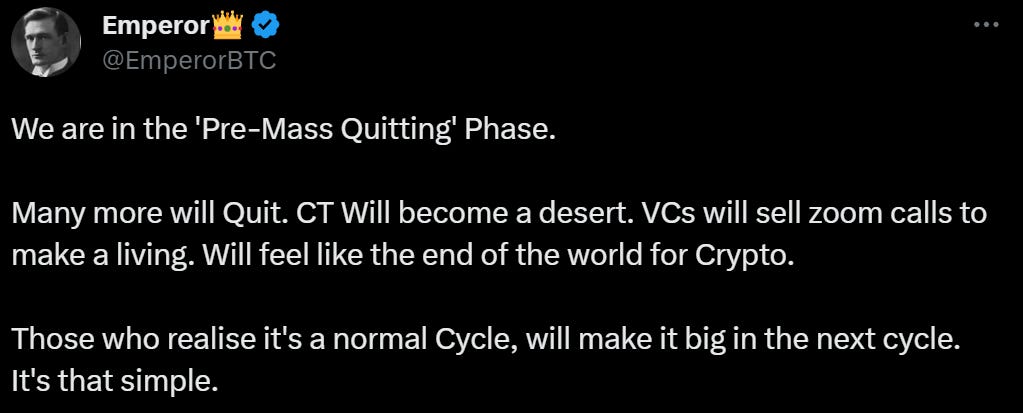 And when volumes for altcoins and meme [coins] unfold, this tends to take place near the later stages of these mini-cycles. When I mean “unfold,” a lot of attention is taking place with these fringe, high-risk assets because interest is at a very, very low point.