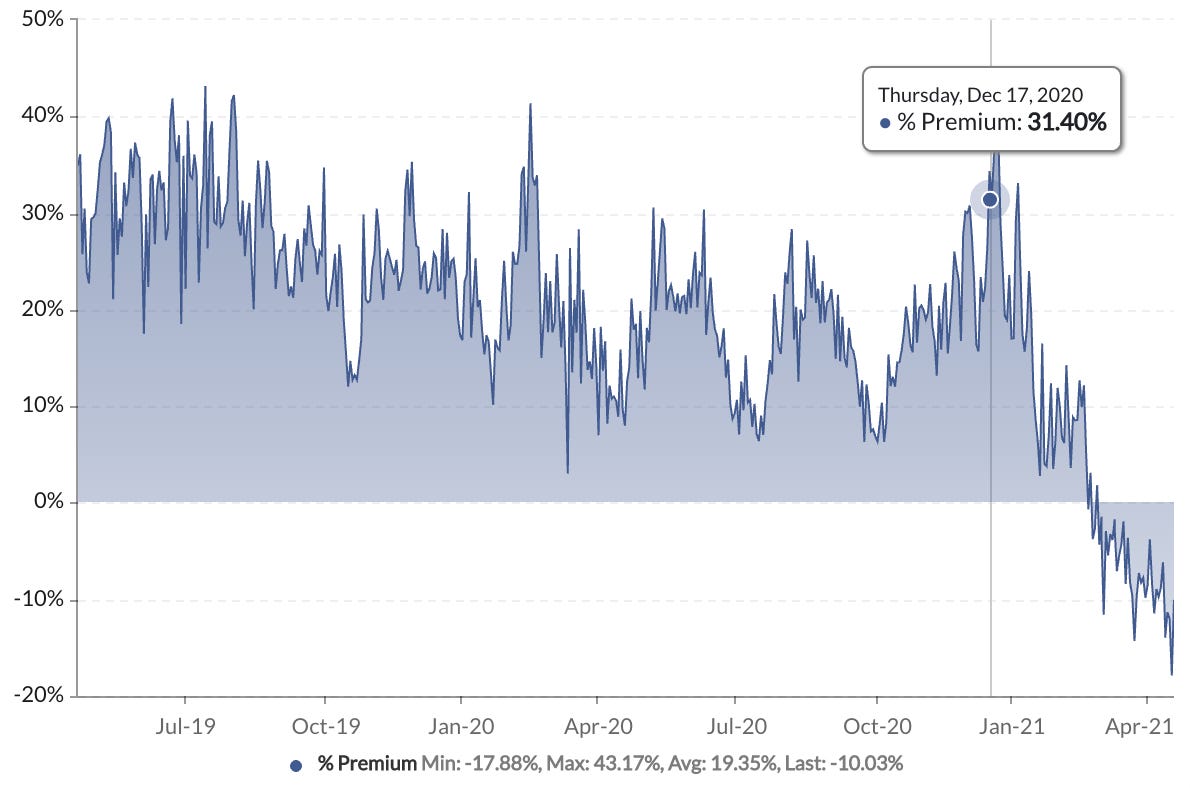 From late December to most recently, the premium went from 40% to -15%.
