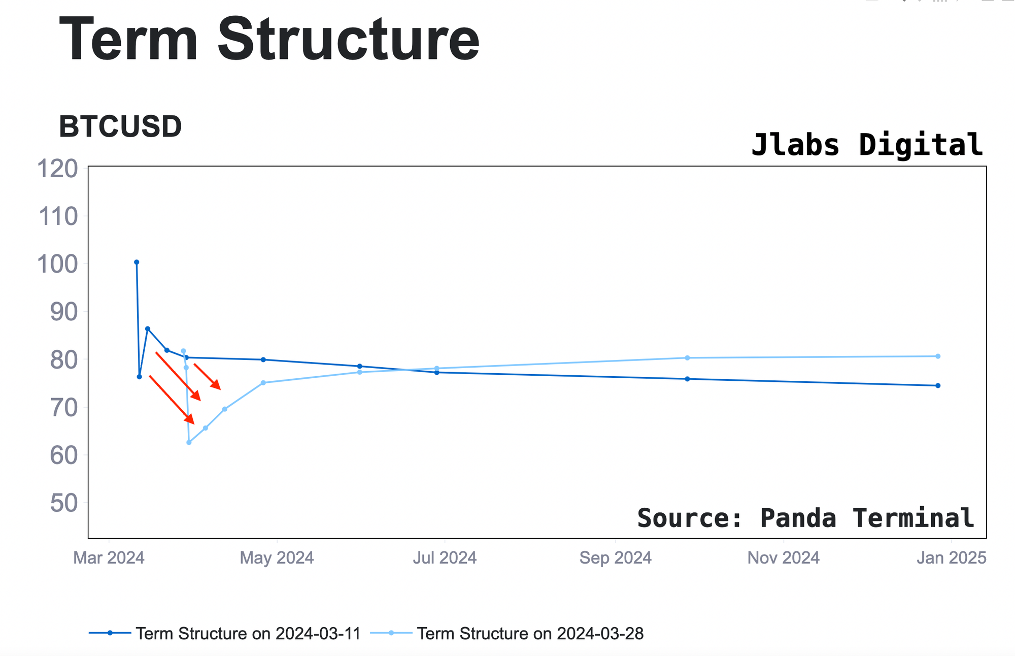 You can see that in the chart below which measures implied volatility (IV) for each expiry at certain date. The dark blue line is March 11 while the light blue line is March 28.