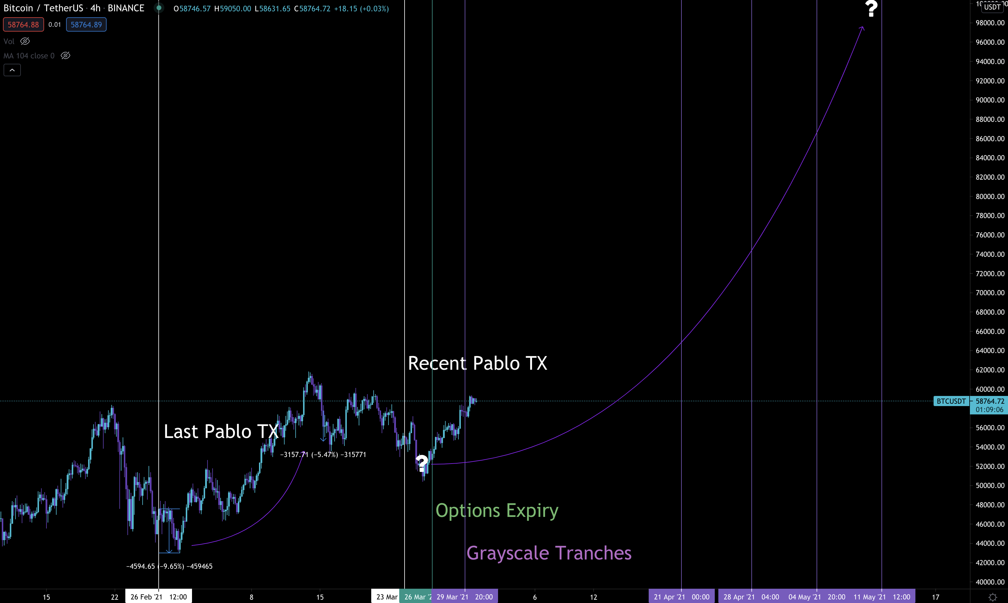 Here’s what that chart looks like today. The only difference between the two charts are Grayscale Tranches. These are upcoming unlocking events to keep an eye on as they near. They help paint the upcoming bullish picture… Yes, that question market in the upper right hand corner is at six-figures.