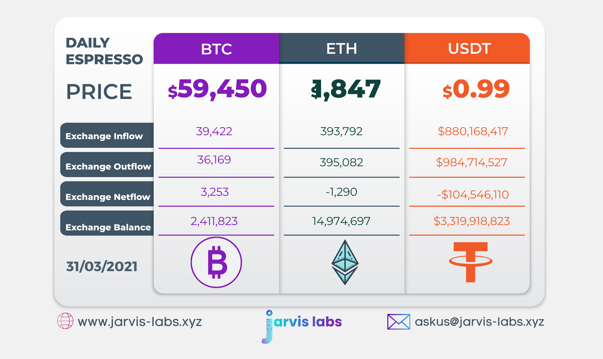 Below is our daily exchange flow data. This is a great gauge for understanding if BTC, ETH and USDt are flowing into exchange or leaving. If BTC and ETH are entering exchanges it can generally be viewed as bearish. The opposite scenario is bullish.