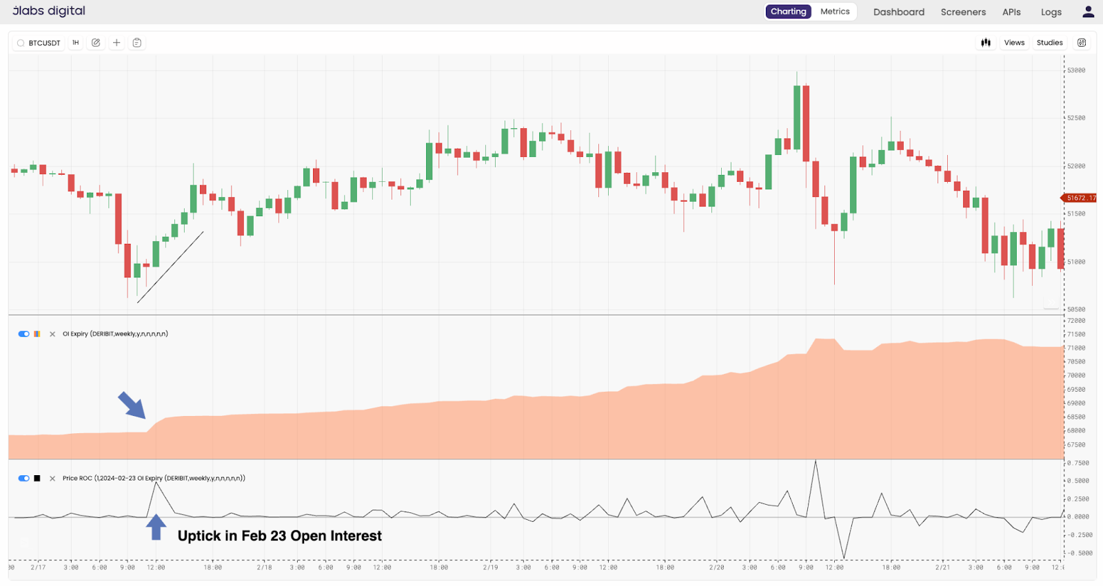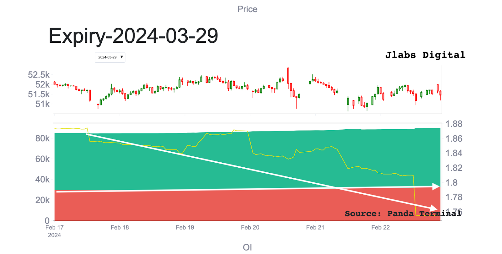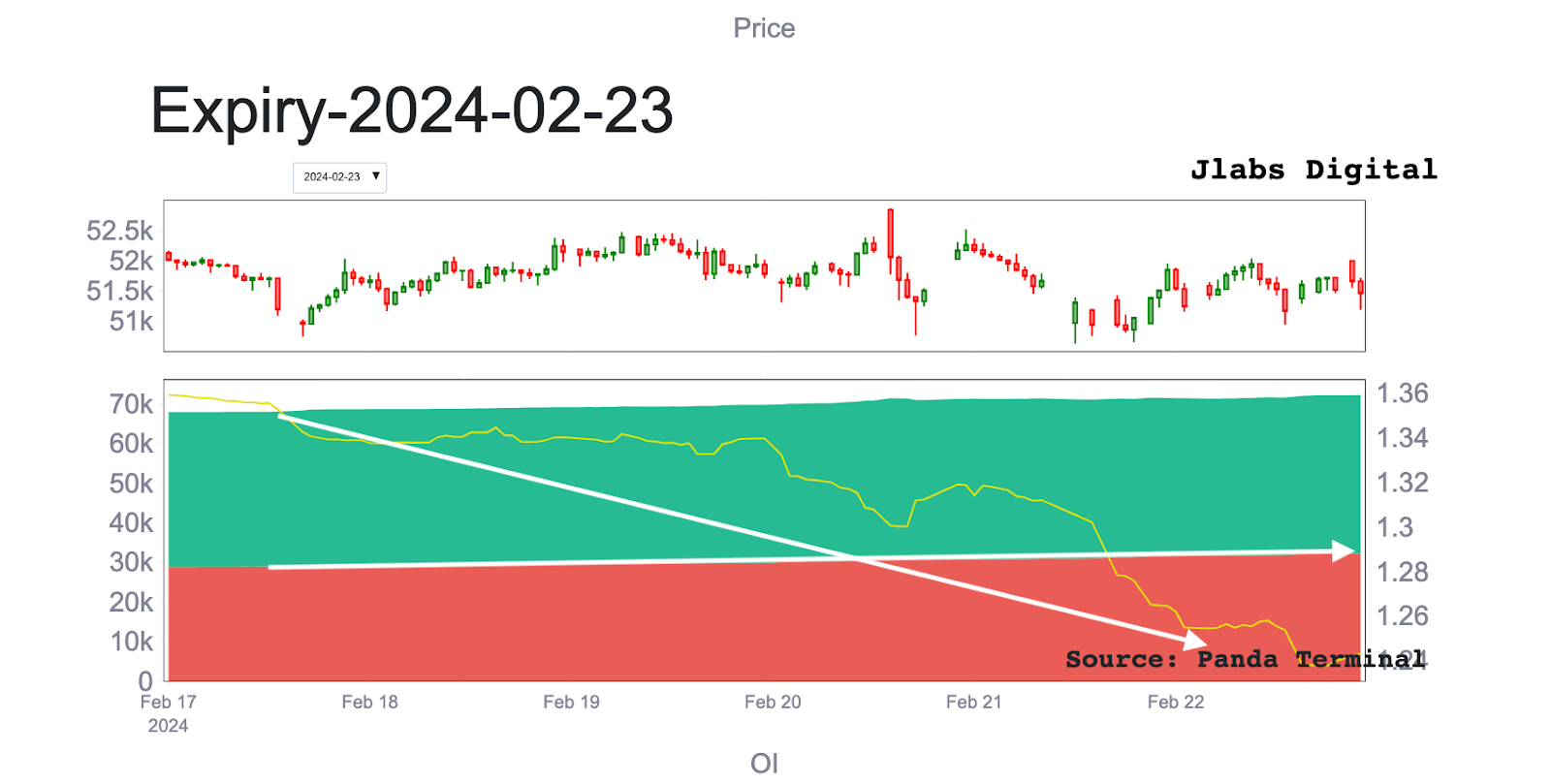 This structure began forming as demand for puts appeared following last Friday’s option expiration. There was a sudden demand for short-dated put options expiring today, February 23rd. You can see when the market quickly began to hedge their call positions with these puts. I highlighted it with the arrows below. The salmon chart shows open interest for the February 23 contract while the subplot below it shows the 24hr rate of change of this open interest.