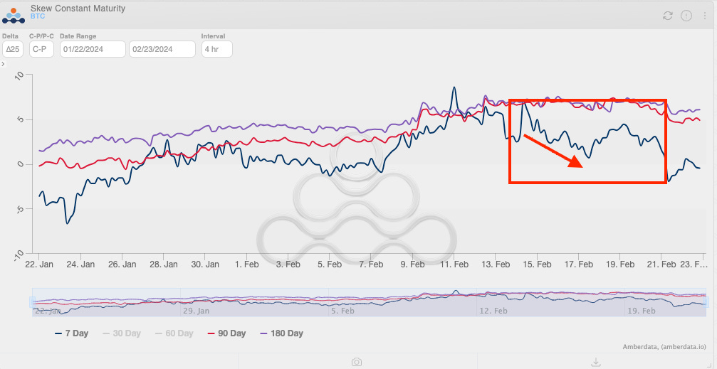 A rising skew is a lot like a funding rate getting very costly for a long. If skew is falling, means shorts are getting expensive to open… Only in this case, for puts.