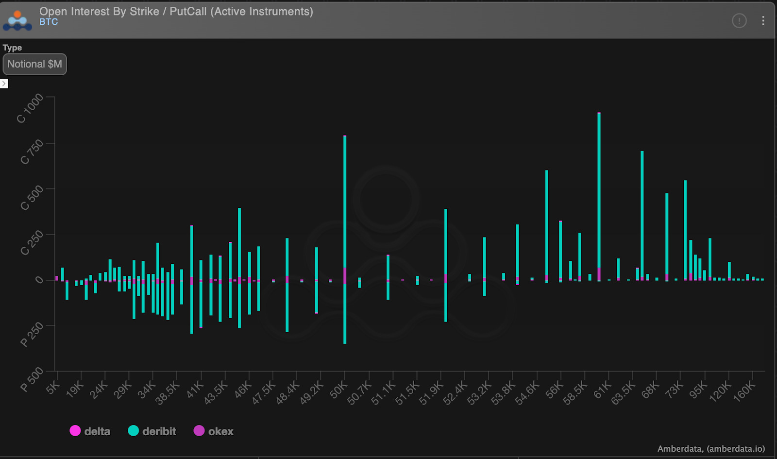 On the chart below we can see how the market is currently positioned whether price goes up or down. We have major amounts of both calls and puts sitting at $52,000 and below. And as we look higher, past the $55,000 level we see it’s all calls.