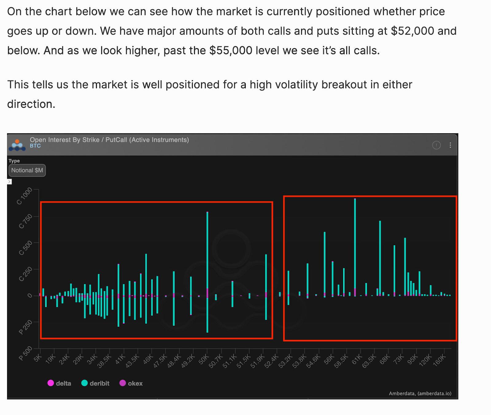 Last week we mentioned the market was bracing itself for a high volatility break-out of the $50,000-$53,000 with huge amounts of open put interest below $50,000 and open call interest above $55,000 as we saw on the net positioning chart below from last week.