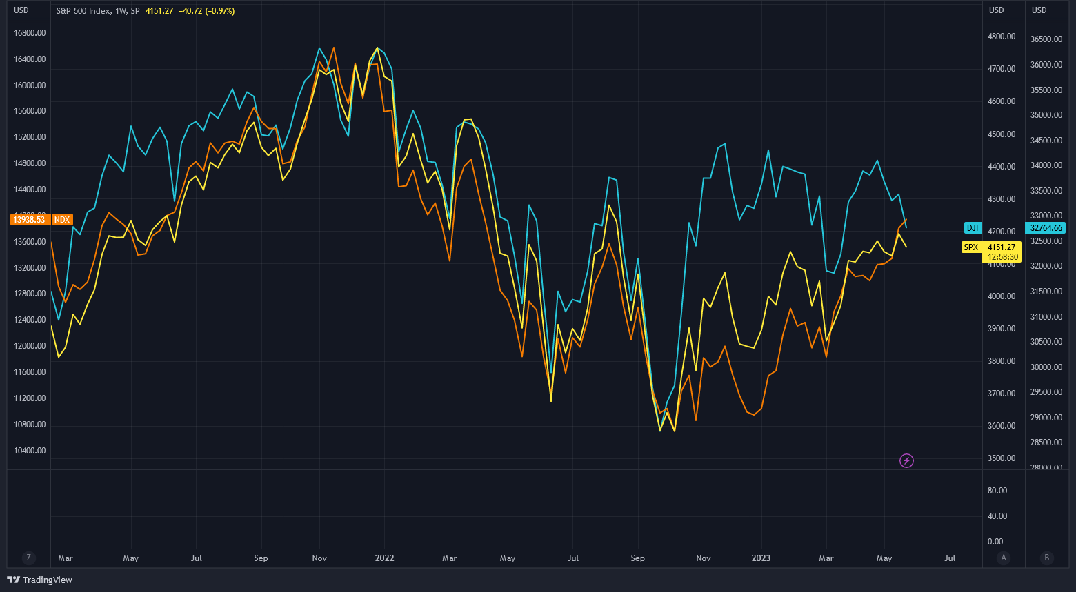 As of the time of this writing, the S&P 500 (yellow line in the chart below) is at 4,151.28, the Nasdaq (orange line) is at 12,698.09, and the Dow Jones (blue line) is at 32,764.65.