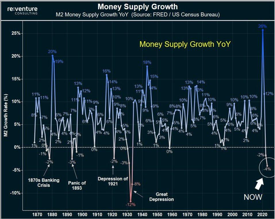 In other words, the amount of money in the economy is falling by almost 5% every year. This is the fastest pace of money supply destruction since January of 1933.