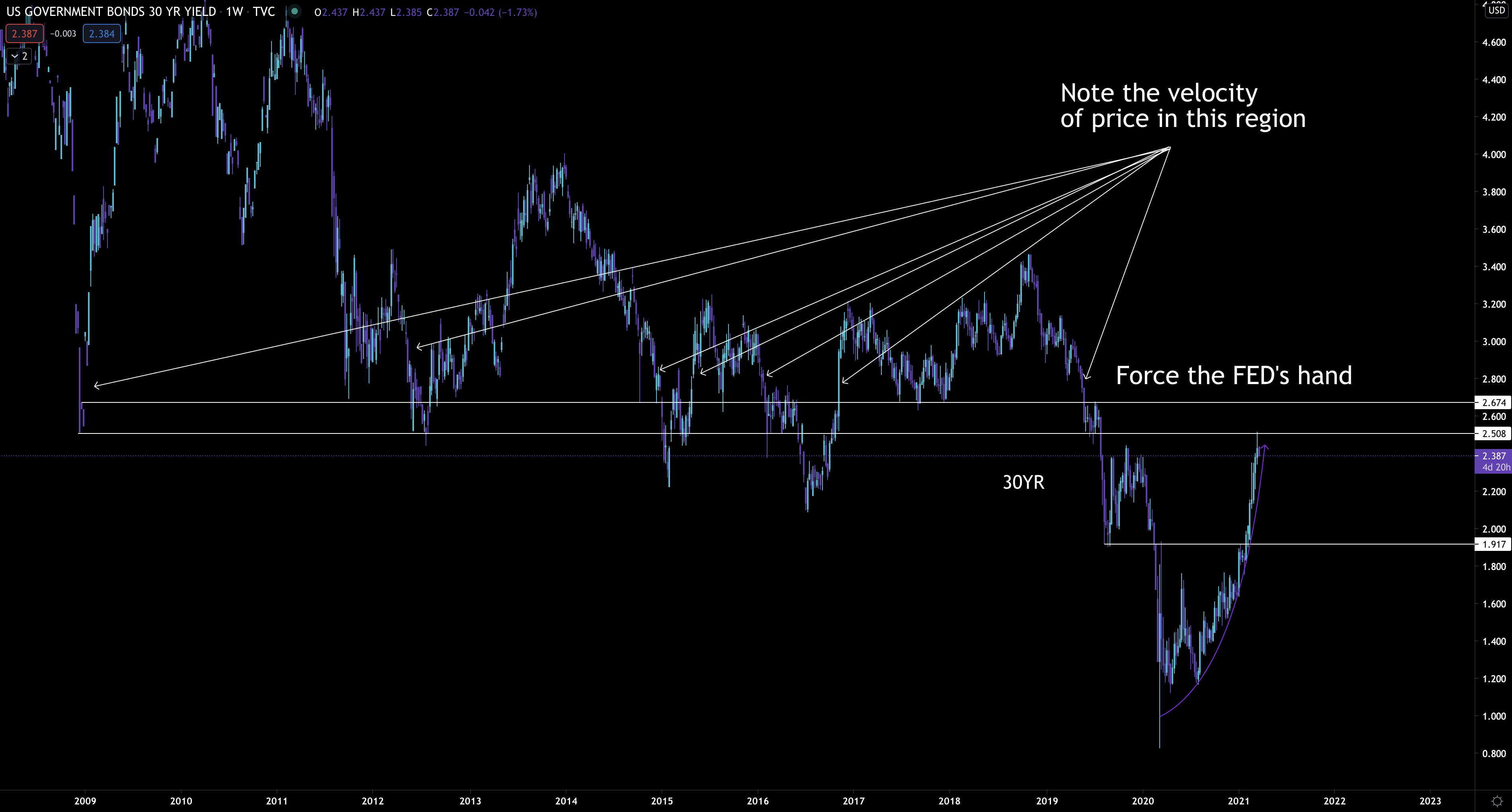 I used white arrows to show when price moved quickly before. If yields get to that range I see no reason it doesn’t happen again. Assuming it does, that’s when I think we’ll see the FED step up their buying of government issued bonds - this is how the FED keeps yields low.