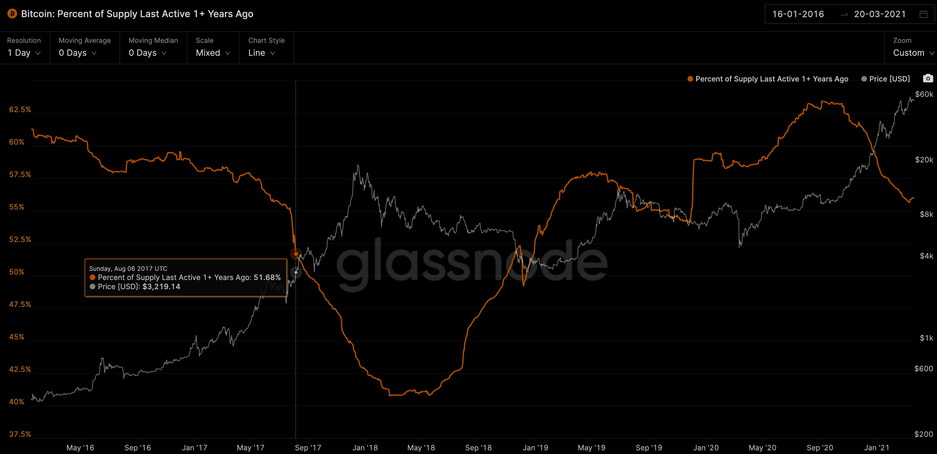 In it there’s a chart that looks at the percent of bitcoin last active 1+ years ago. It’s a helpful chart when deciding how close we are to a market top. Every peak of bitcoin’s past market cycles have occurred just before the orange line below bottoms out.