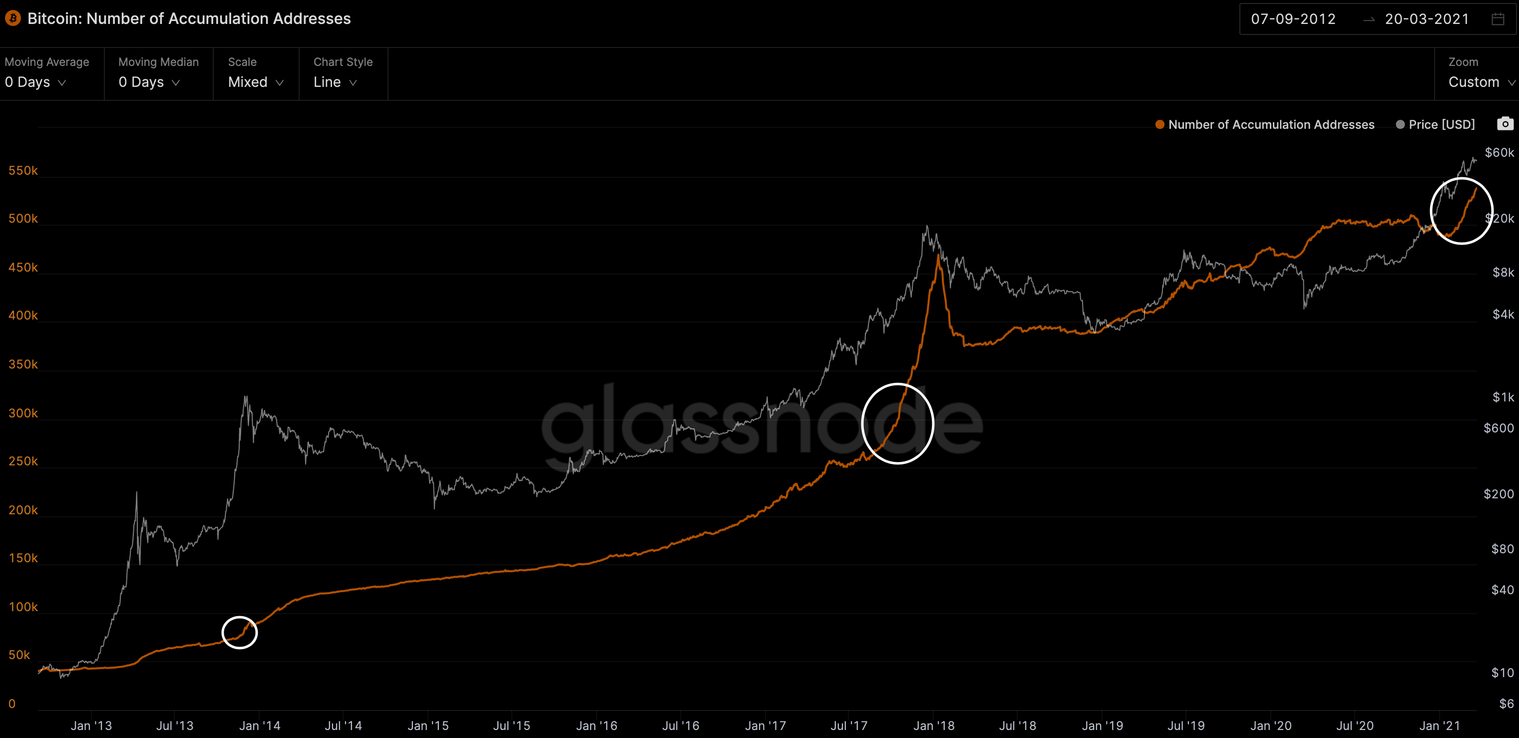 The chart below is the number of bitcoin addresses accumulating. These are wallets where more than two transactions took place that were not “dust” or the wallet isn’t viewed as an exchange wallet.
