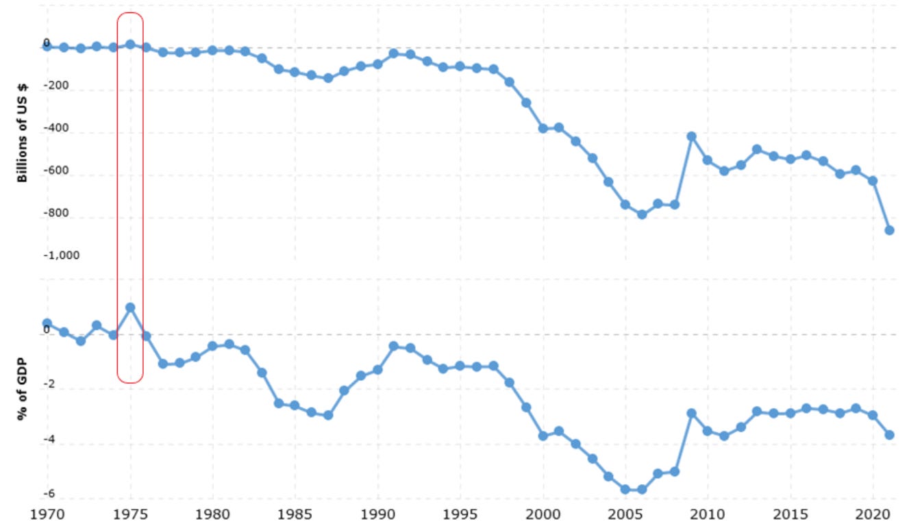 Below is a chart of the U.S. trade balance from 1970 to 2021, measured both by amount and as a percentage of GDP. The red outline highlights the last time the U.S. had a trade surplus, which was in 1975.