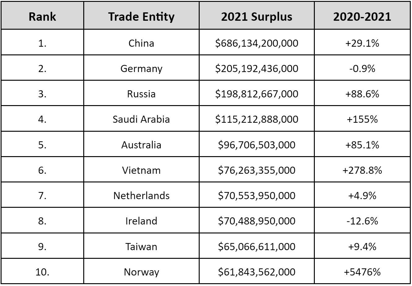 Below is a table of countries with the highest trade surpluses in 2021.