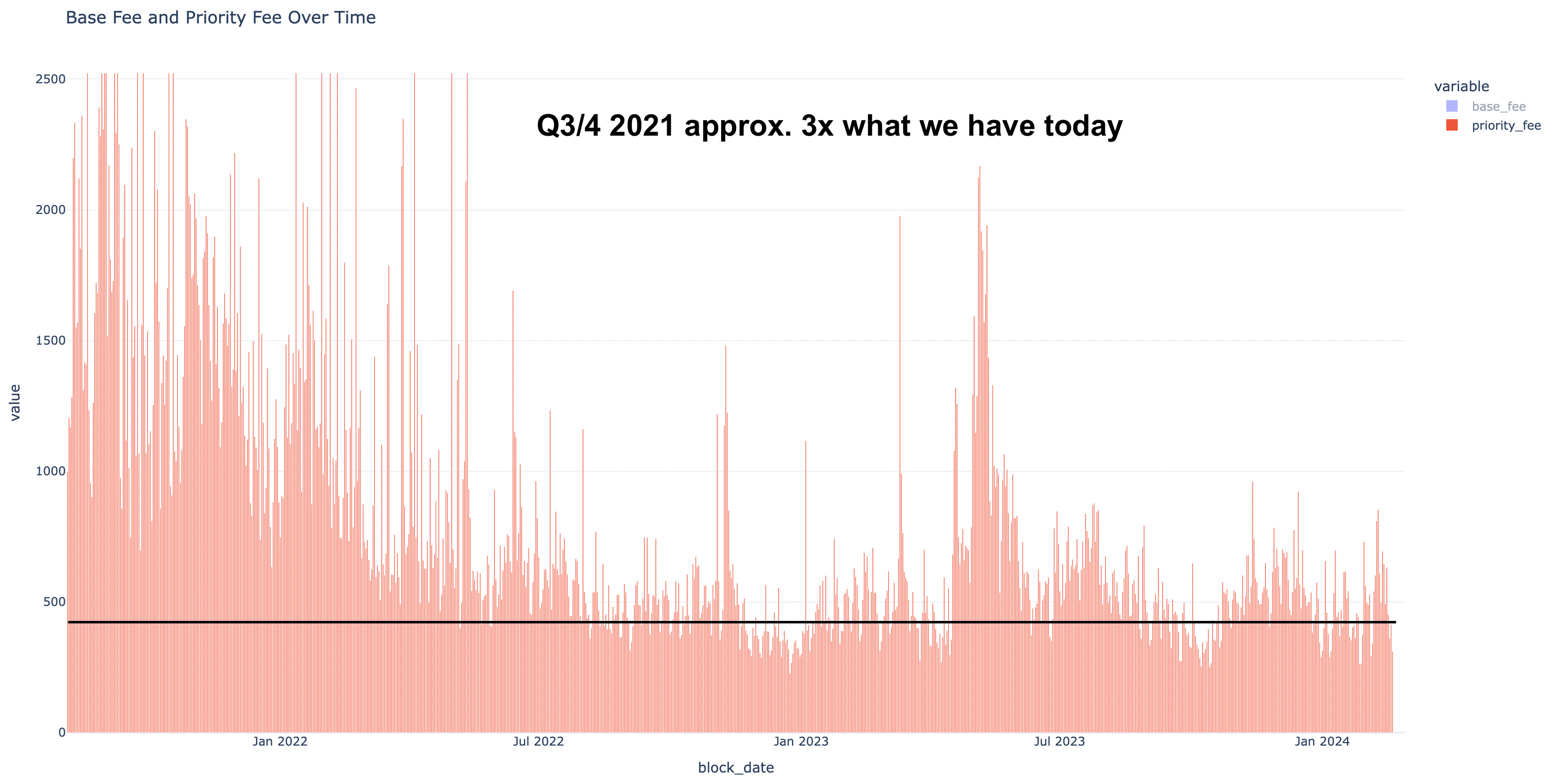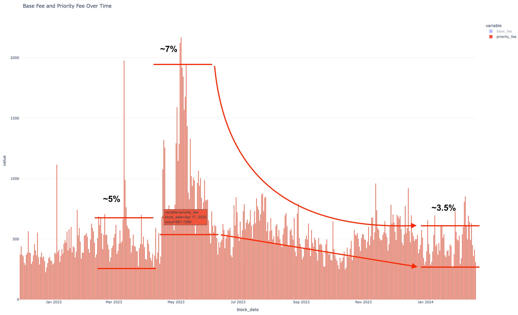 You can see the April spike below where yield surged to more than 7%. During that month there was about 2x more priority fees coming through the network than what we see now.