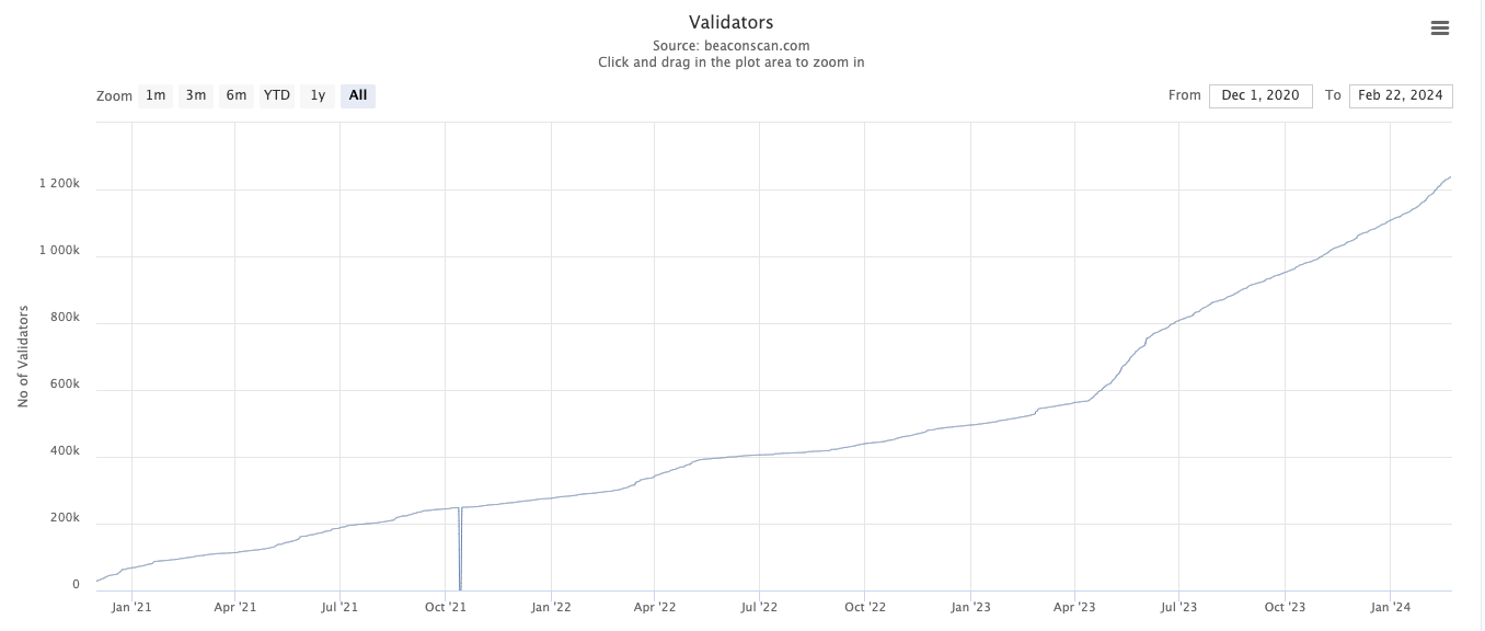 But since then, yields have dropped to mid 3%. This is the yield we see with more than twice the amount of validators on the network.
