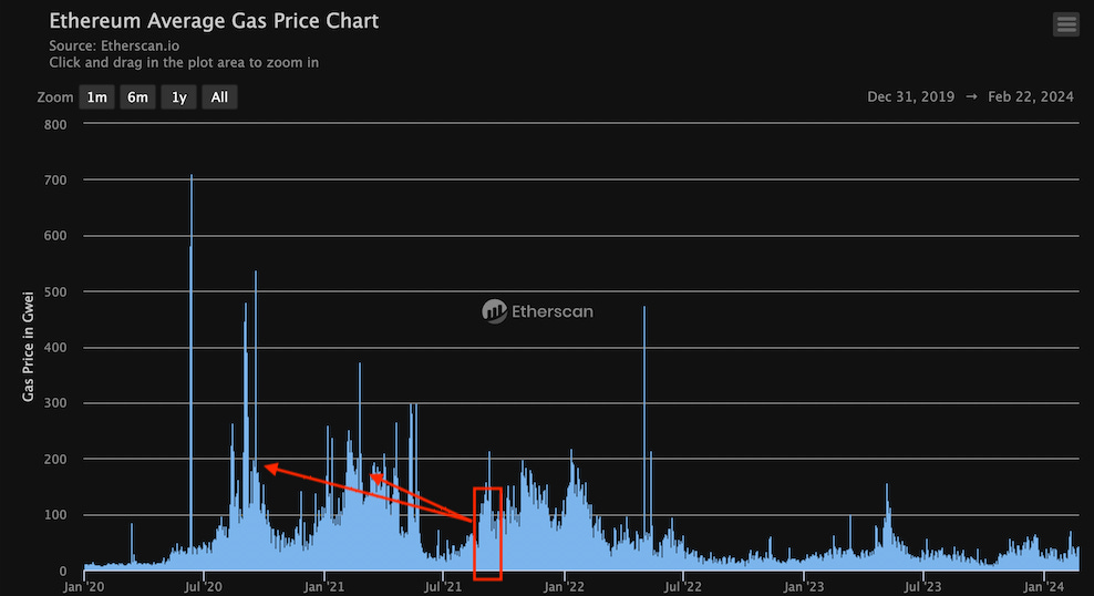 But asking if we can return to April 2023 standards is not what we should be looking at. If anything we need to see what was happening during the last cycle. To get a taste, the left portion of this chart below is September 2021, the tail end of the bull run. Fees were about 3x larger than what we see today.