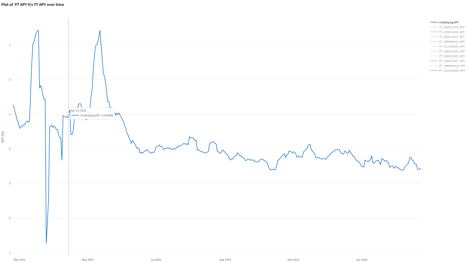 It’s another internal chart where we need to update the font to be larger for public viewing… Nonetheless, it showcases the yield of the various intruments that exist on Pendle. It’s like viewing the yield over time for a 2-year Treasury in a way.