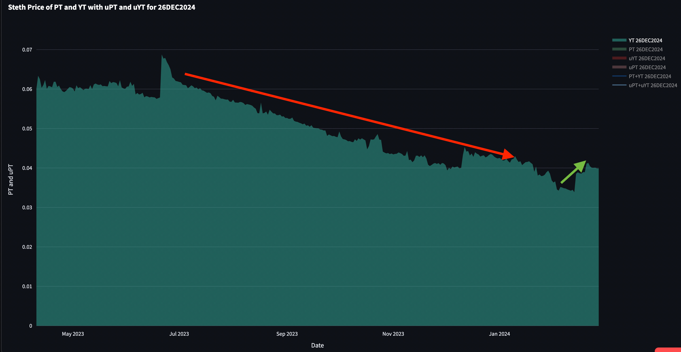 In the chart below, you can see the YT token for the 2024 stETH instrument trends lower. That’s because the YT holder is earning the interest daily on the locked stETH. As each day passes and the holder earns interest, the value of the token falls - all else equal.