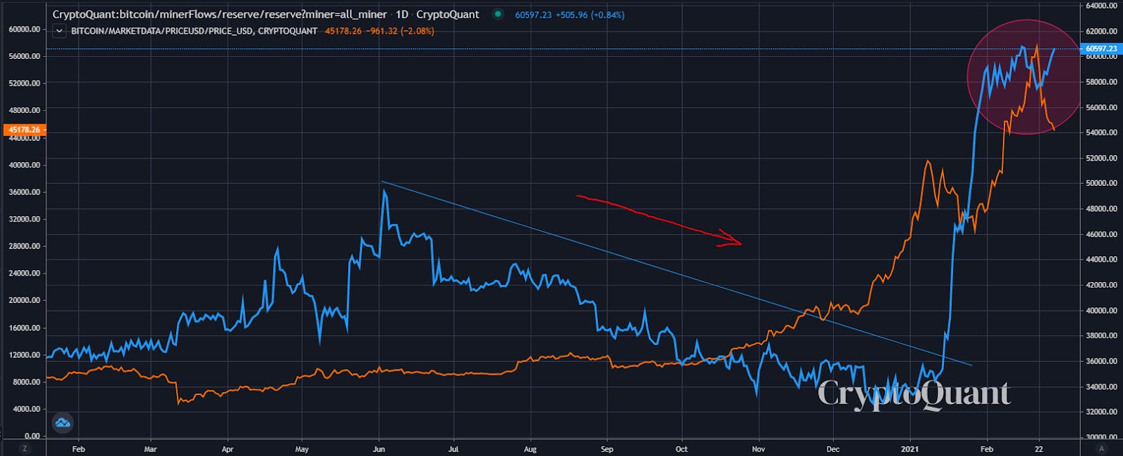 And in response, the price per bitcoin quickly moved higher towards $60k as miners were hoarding.