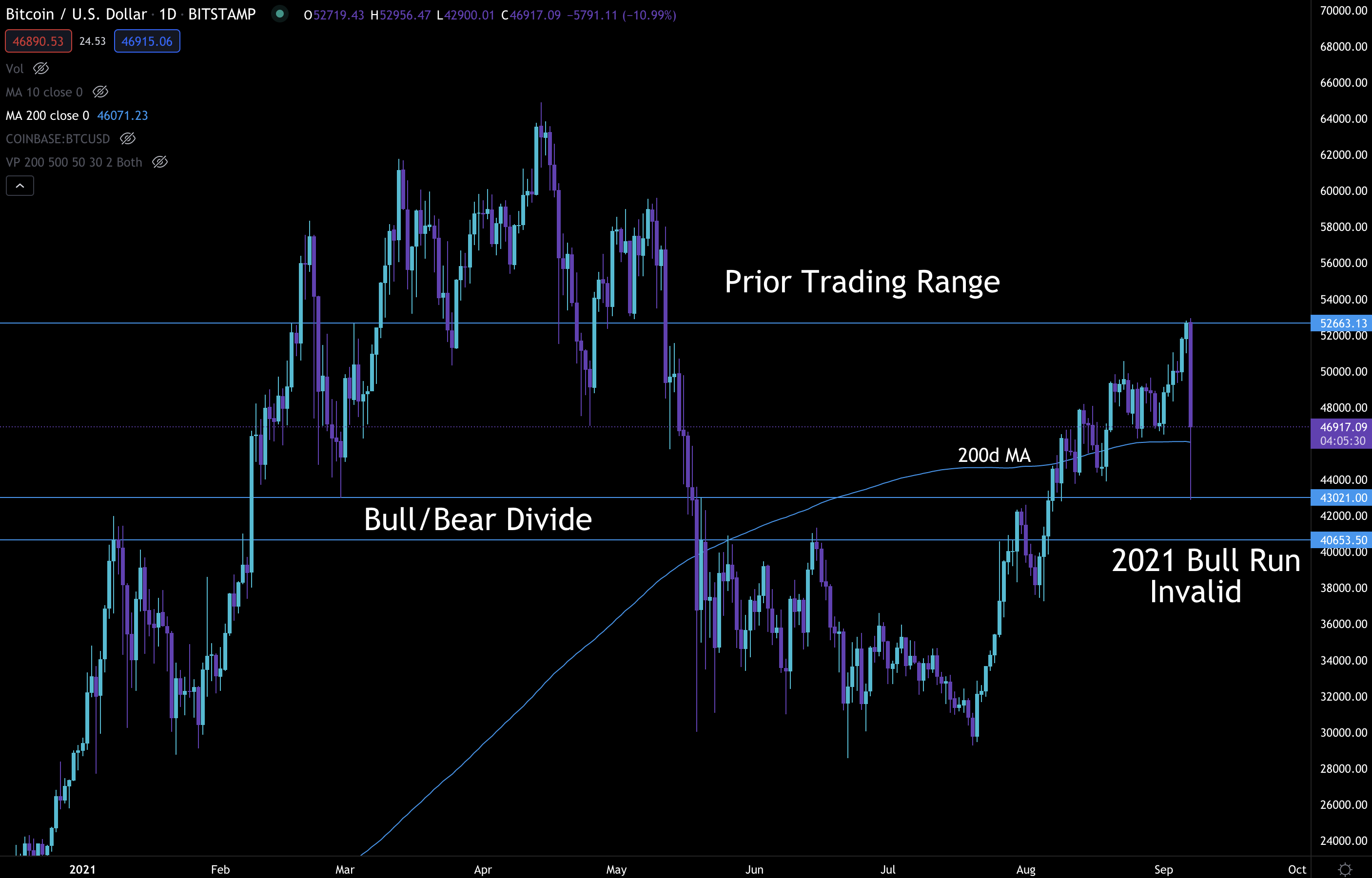 If we form a lower low (<$43k) then a late-2021 bull run appears to be a very low possibility. In the chart below this would mean price entering the “Bull/Bear Divide”. With a close below it we are full bear mode.