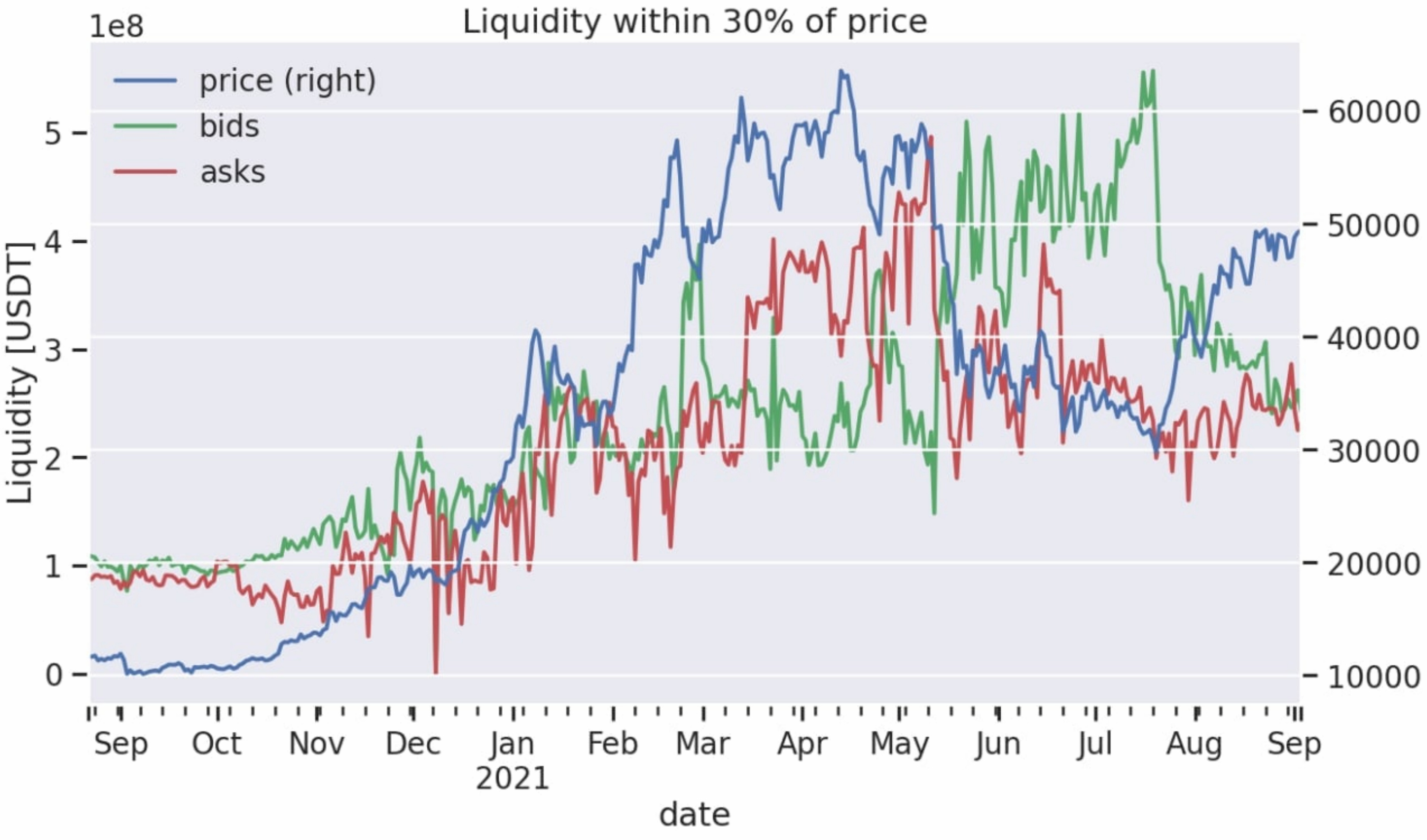 To explain this one, let’s look at a chart by our friends from Material Indicators. It shows how much liquidity is within 30% of the current price of bitcoin on any given day.