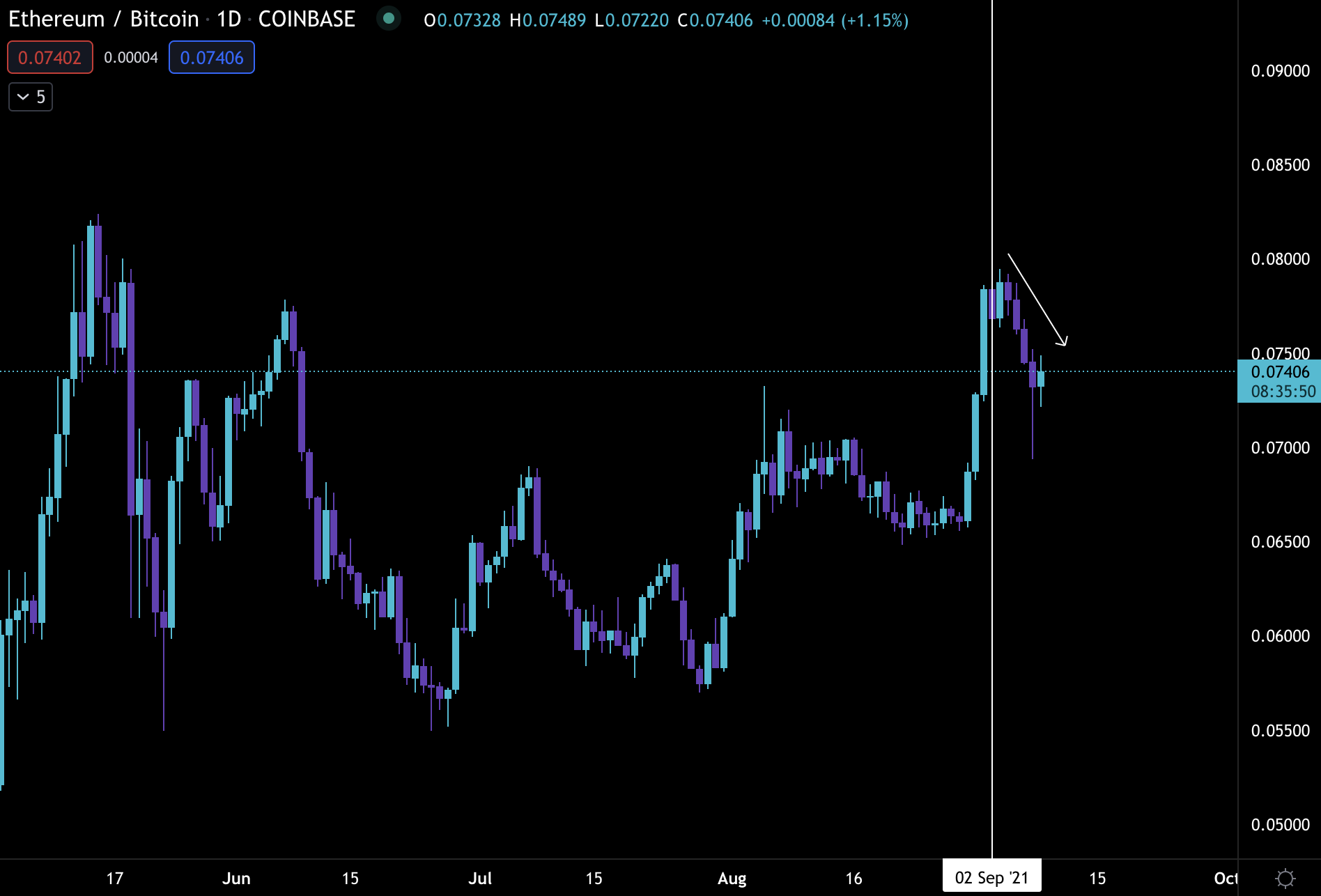 Since the auction you can see what happened to the price of ether compared to bitcoin in the chart below. It sagged.