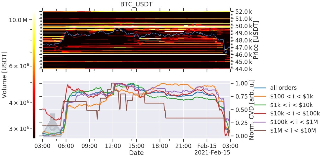 The brown line signifies orders between one and ten million dollars. Meaning whales were sitting there to absorb all the selling and buy it up.