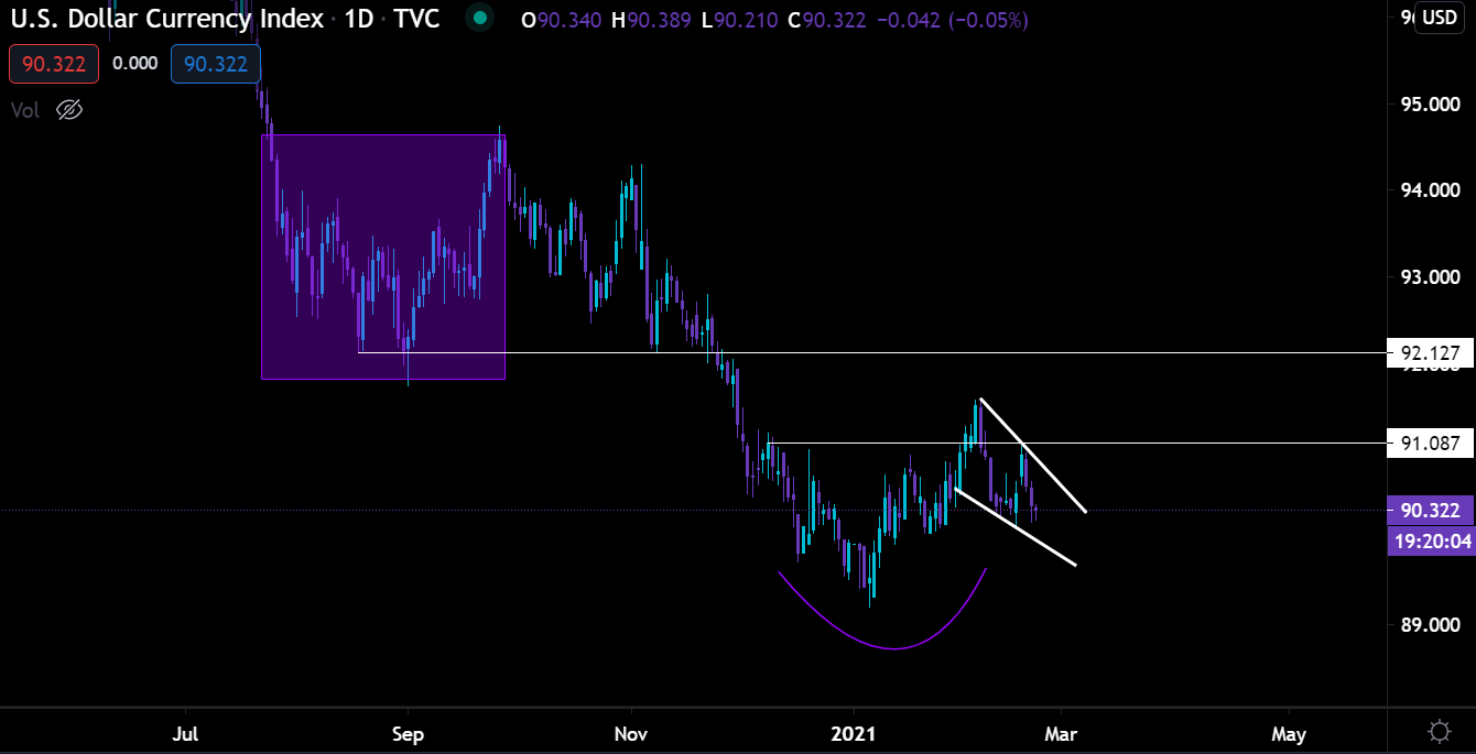 Taking a look at the chart the inverse head and shoulders pattern hasn’t given up. It’s now forming a bit of a wedge. A break here that rises above 91 is bound to have a little spill over into bitcoin and crypto. The results of which would mean capital is flowing into DXY, not crypto. And it’d be the headwind we mentioned earlier… But not for long.