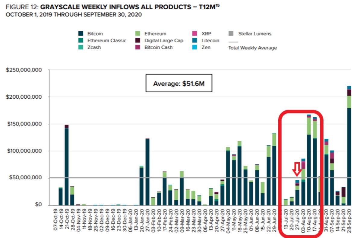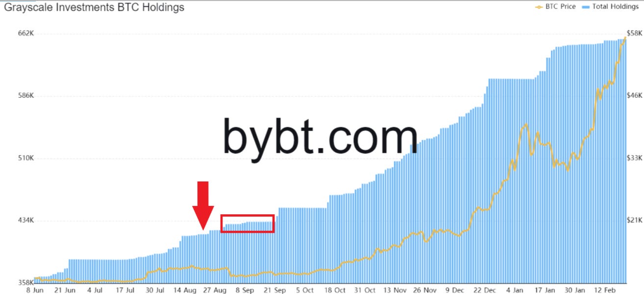 The main reason is seen in the chart below. It’s Bybt.com’s grayscale BTC holdings. This shows the increase in BTC in the Trust over time by day. The chart you looked at previously was by week. Meaning the chart below is more granular.