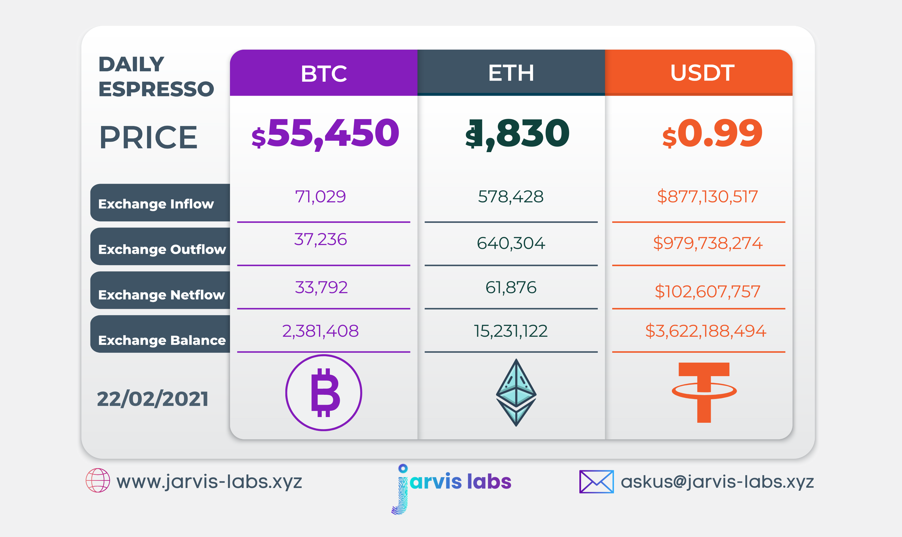 Below is our daily exchange flow data. This is a great gauge for understanding if BTC, ETH and USDT are flowing into exchange or leaving. If BTC and ETH are entering exchanges it can generally be viewed as bearish. The opposite scenario is bullish.