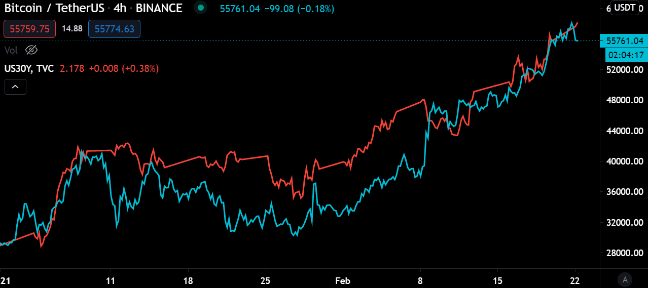 Here’s bitcoin (teal) against 30 year yields (red) in the chart below. As you can see they are in lockstep.