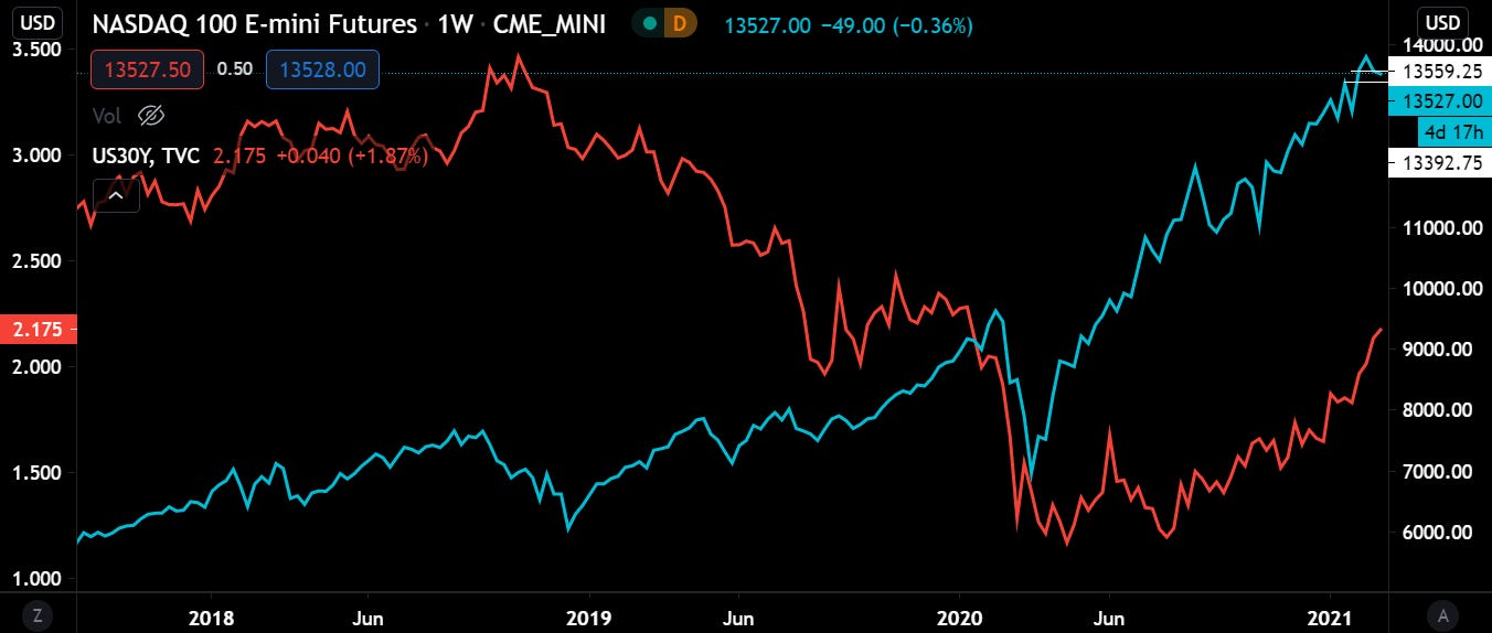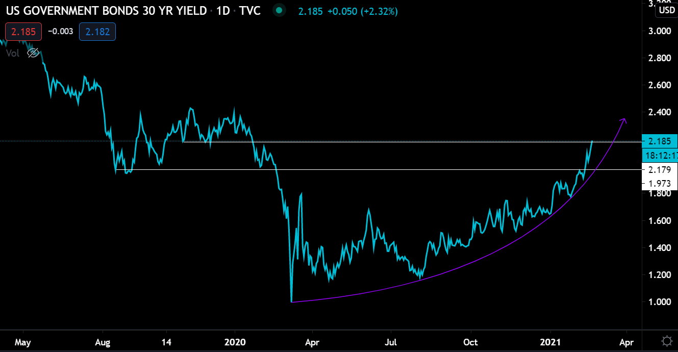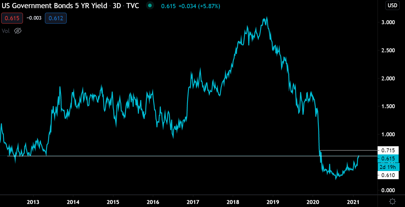 Typically, rising yields make it more attractive for money to flow out of riskier assets and into a vehicle earning a higher yield - Government bonds in this case. If yields start running higher they can act as a temporary hiccup to the equity and crypto bull markets in the very near term.