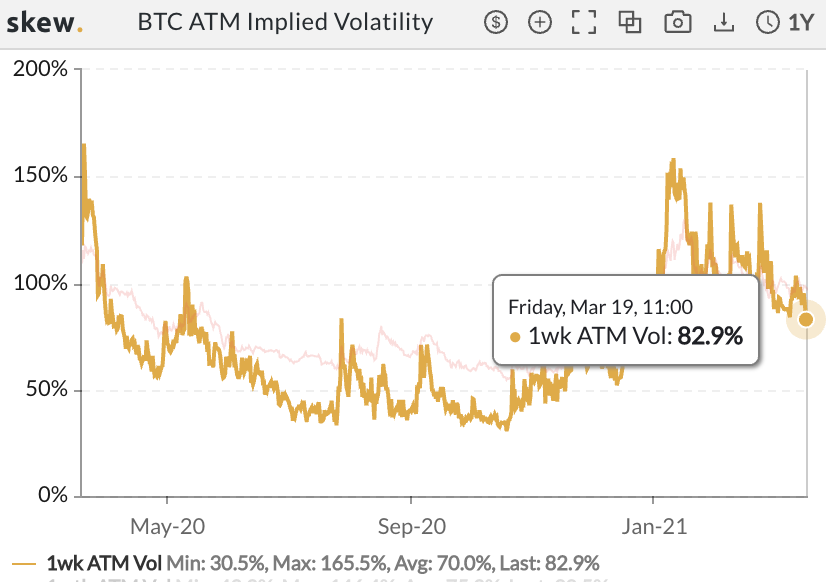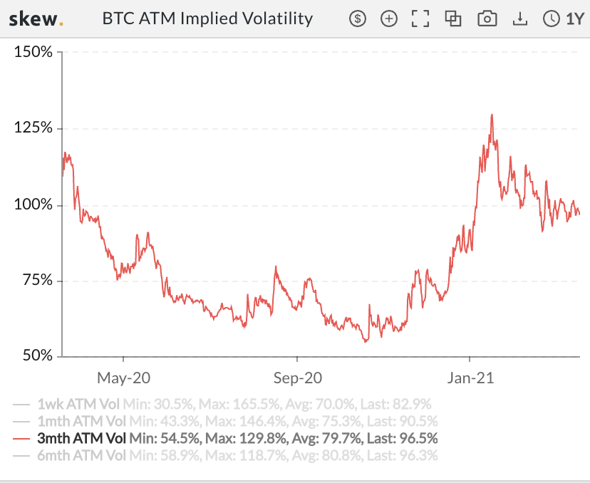 Here’s a chart of the one week IV for bitcoin options. It’s currently at 82%. This is down from a 152% reading that happened around January 14th.