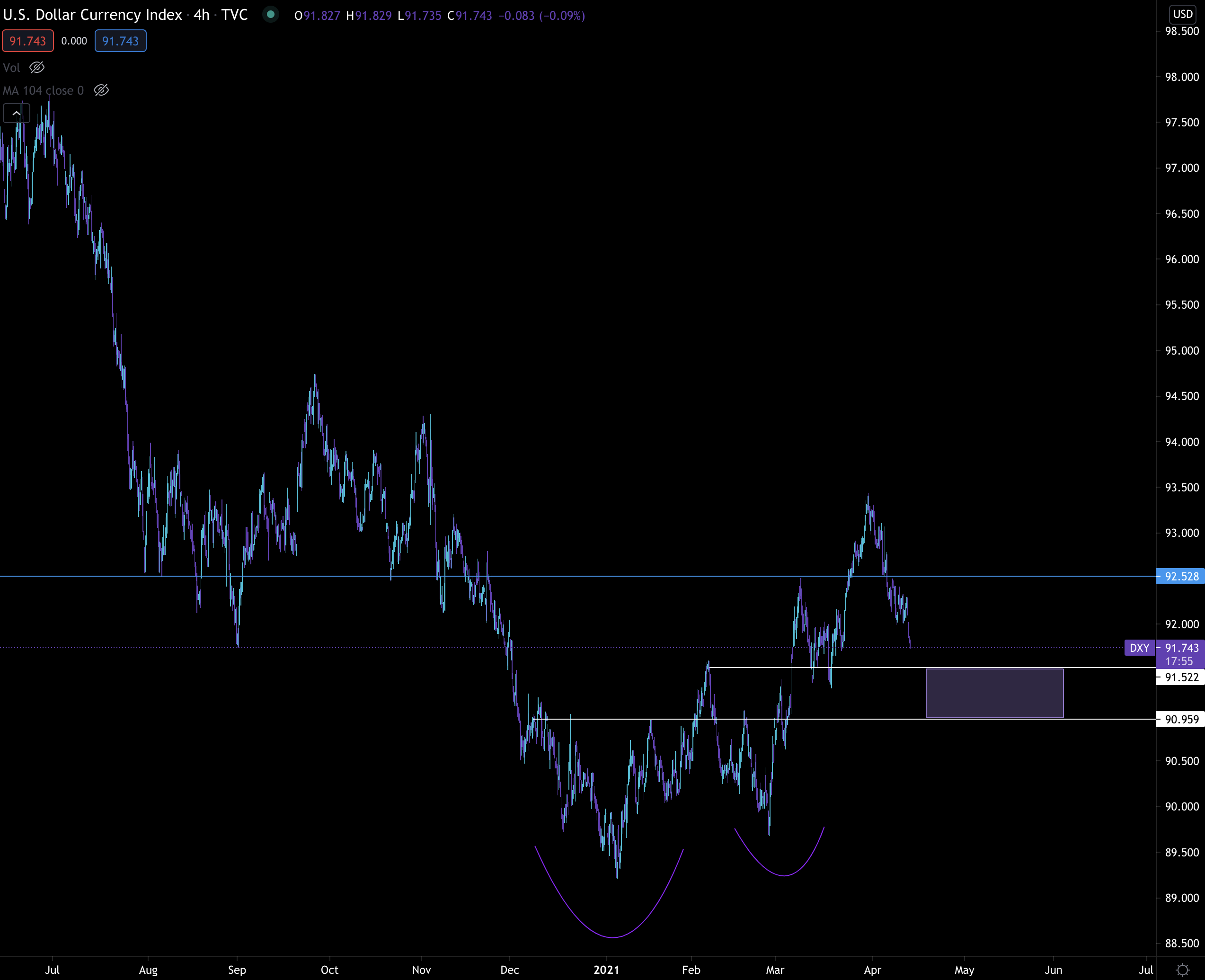 Right now we’re watching that purple box for an area that might pose as a pivot or reversal area. If the dollar loses this range, bitcoin is likely to rip higher.