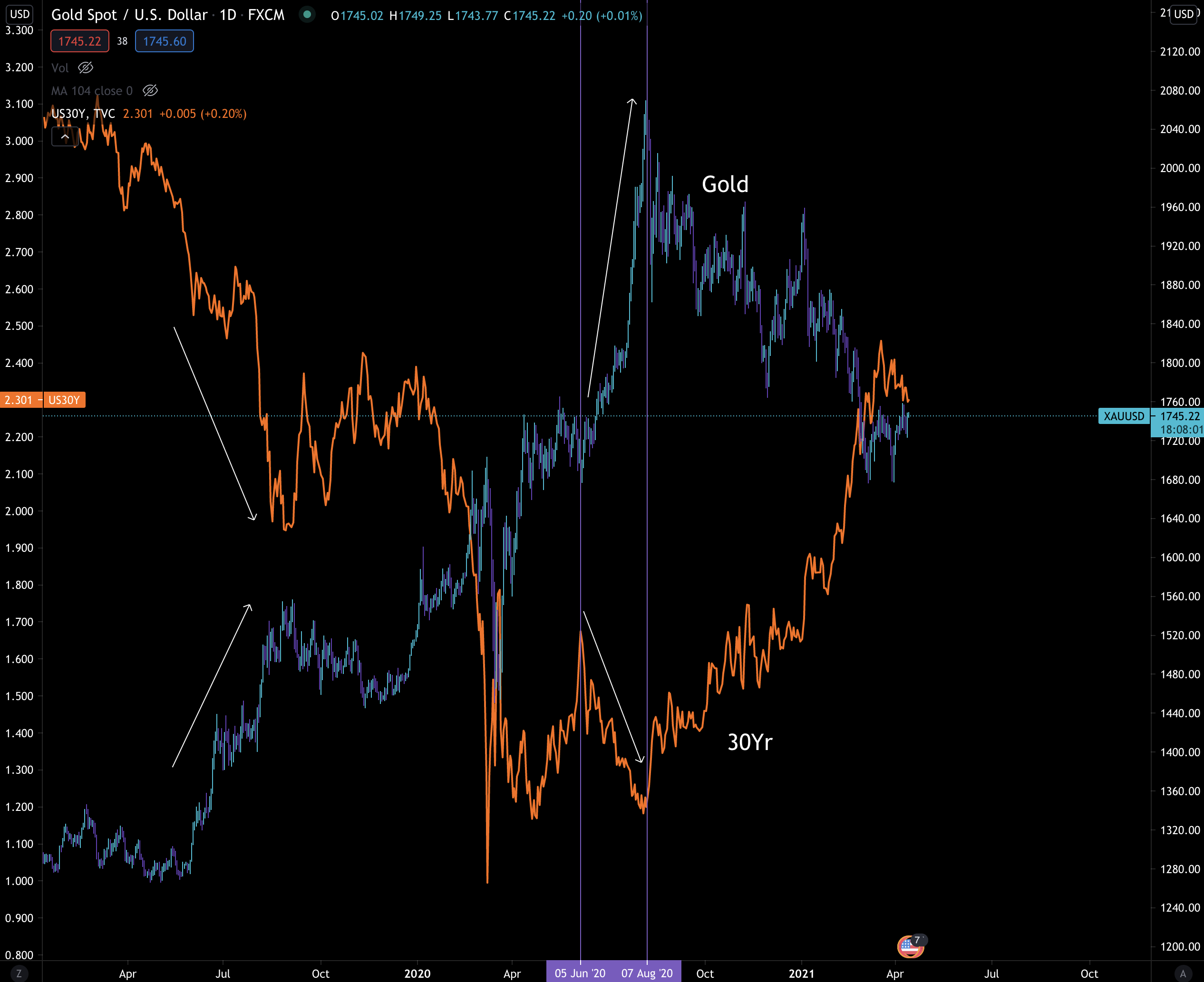 To figure out why that’s the case we can lean on a gold versus 30yr yield chart.
