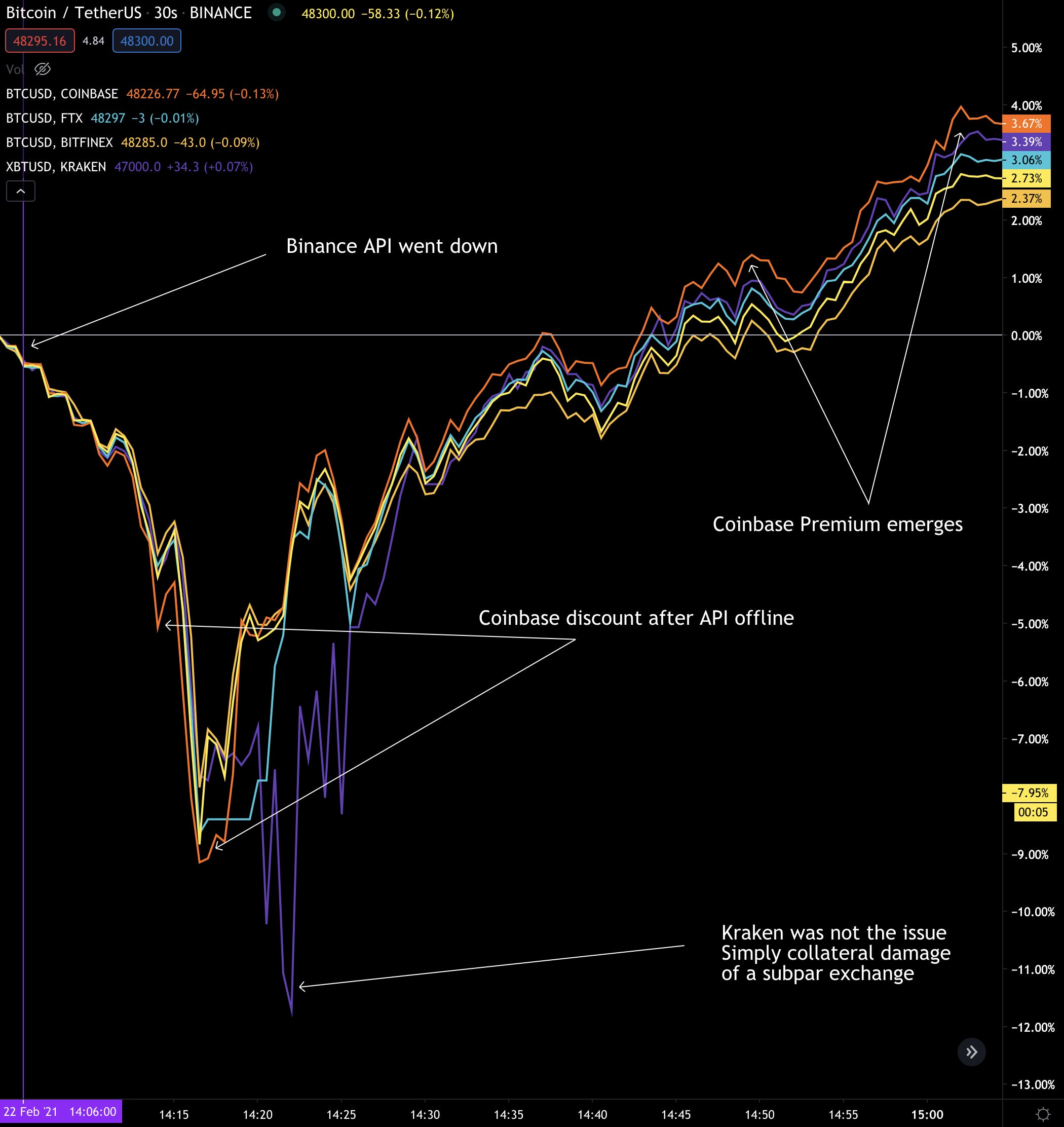 So what happened here? Did the same entity that pushed prices down on Coinbase act on Binance to buy up BTC at a discount while the little guy sat idle on the sidelines reading their liquidation e-mail from Binance? And perhaps contribute to technical issues?