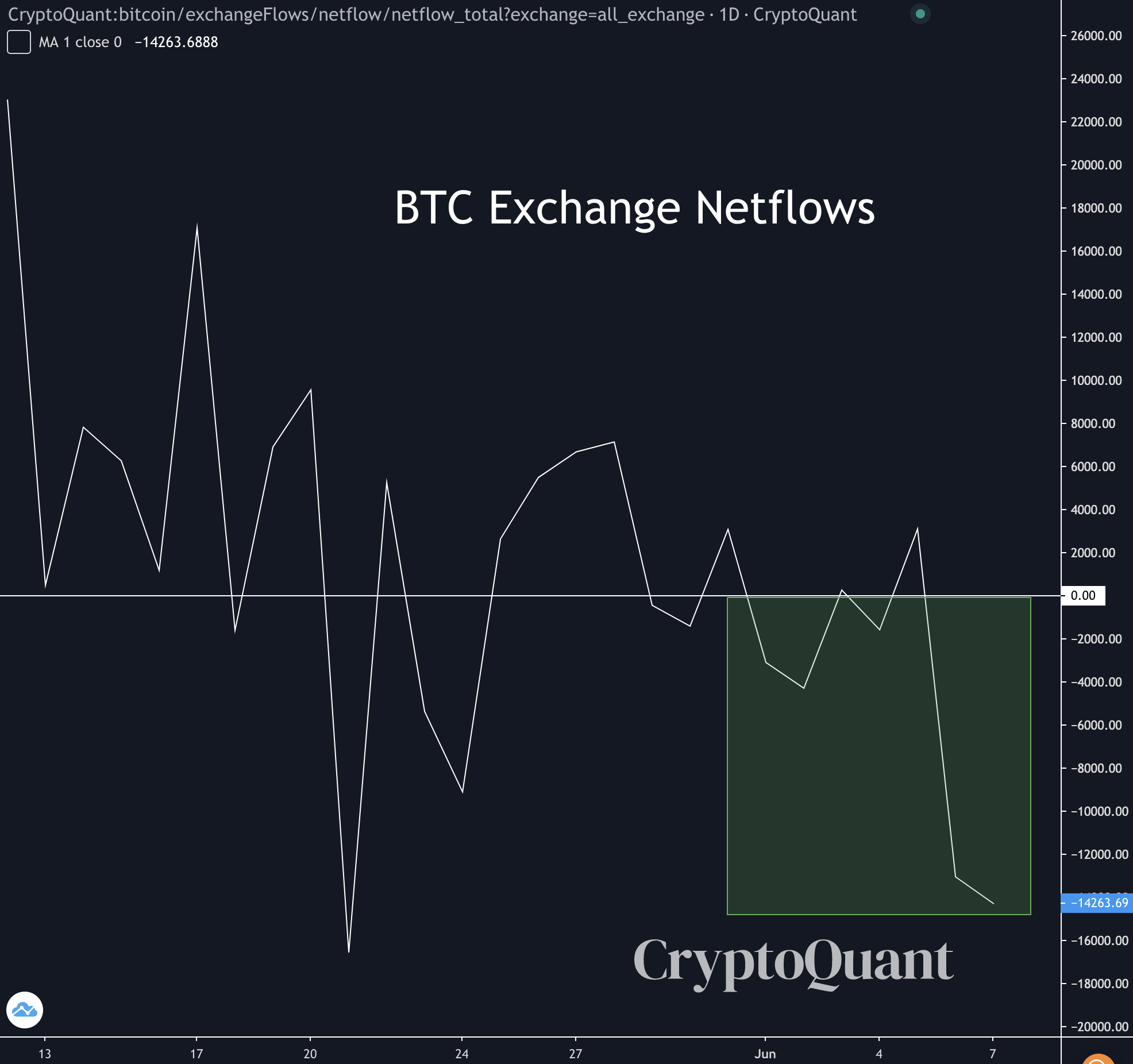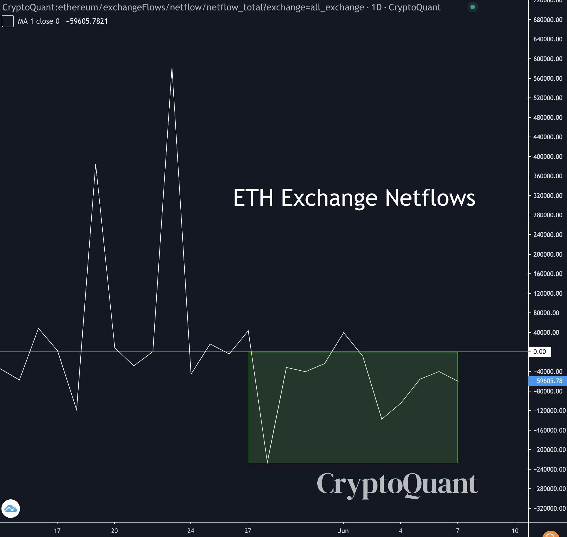 ETH was no different. Exchange reserves have dropped by 704k ETH since May 27th. And ETH netflows from CryptoQuant support the steady negative readings we see on our end as well.