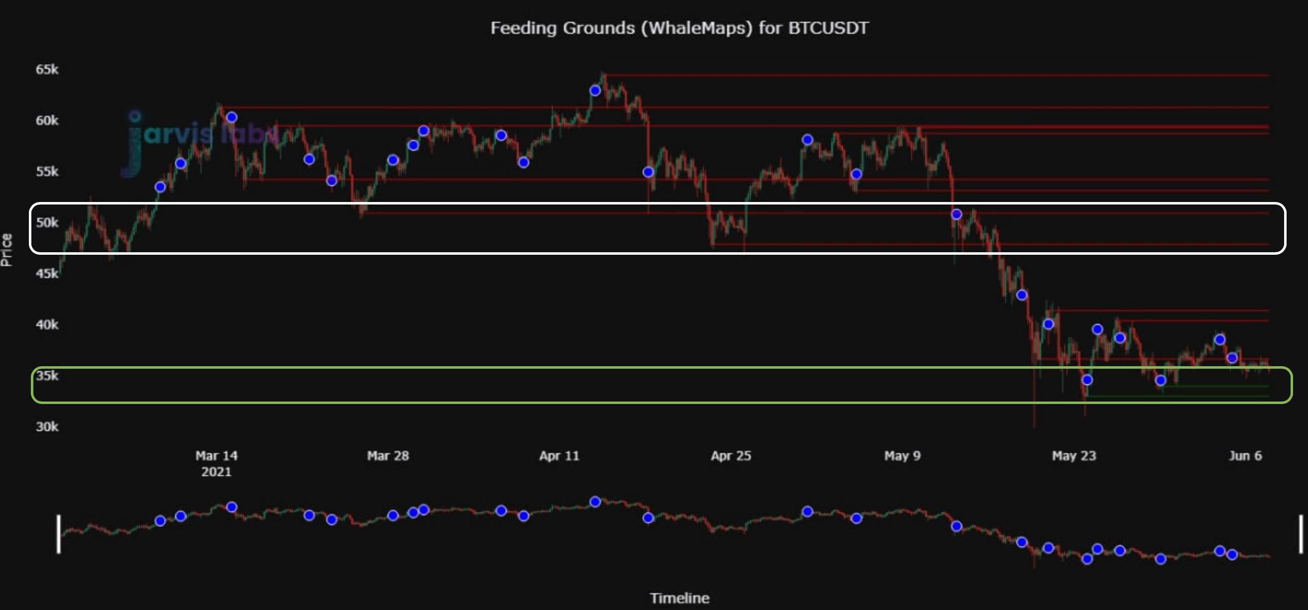 Now, to get readers up to speed… when we spoke last Friday in “When to Strike” we touched on our onchain Feeding Ground Whalemap for BTC. It’s how to view onchain supports and resistances. Here it is with boxes around the areas of interest - $50k and $35k.